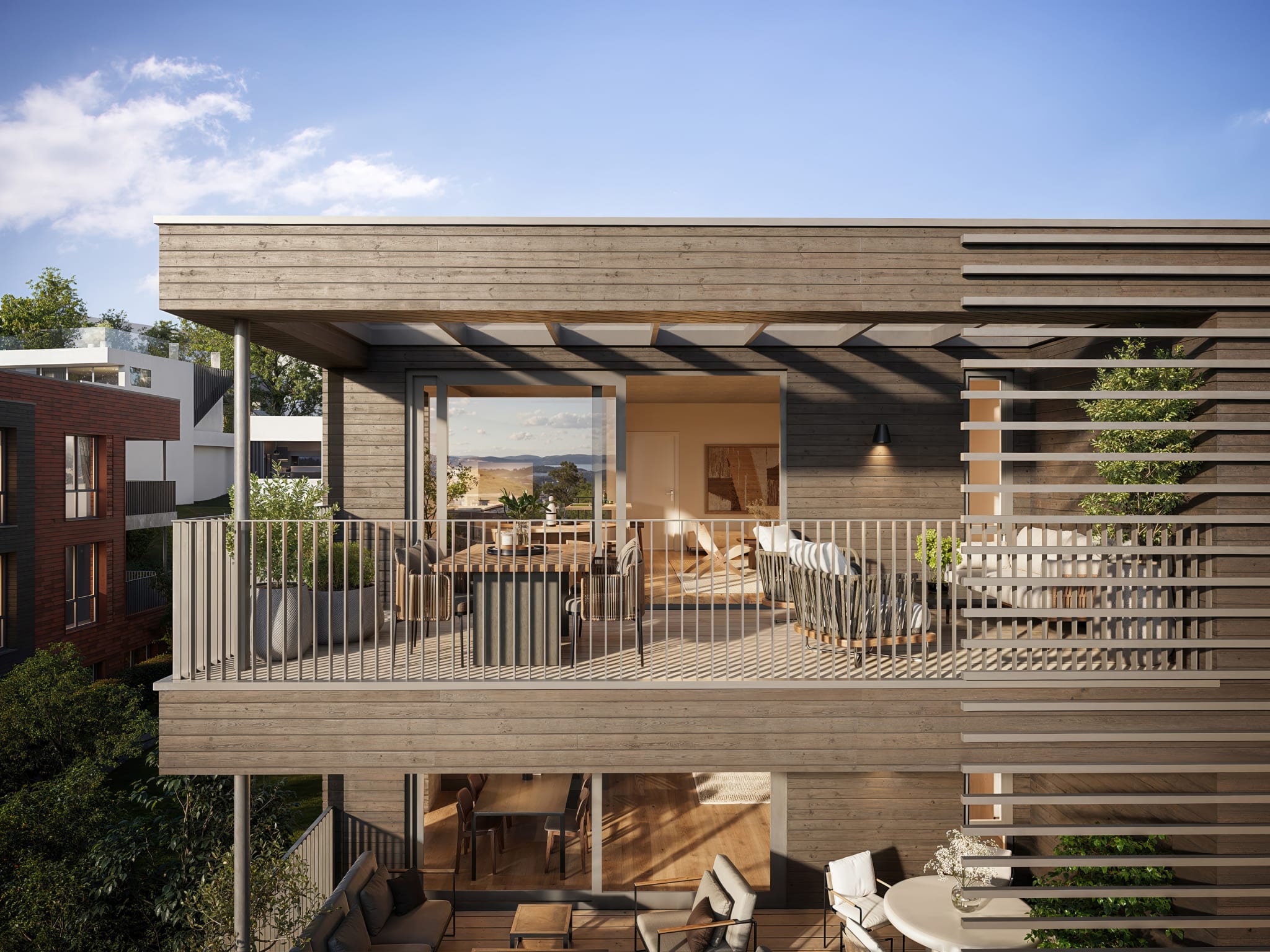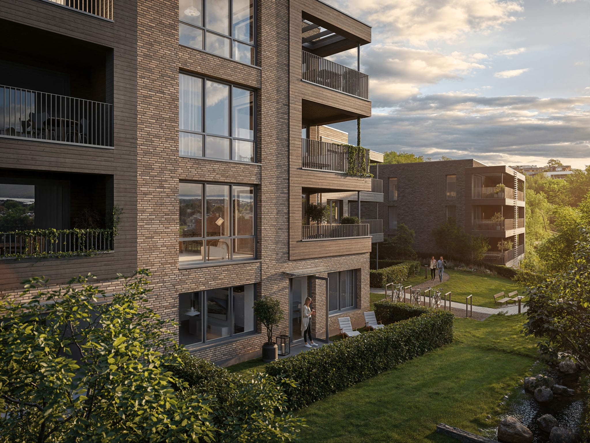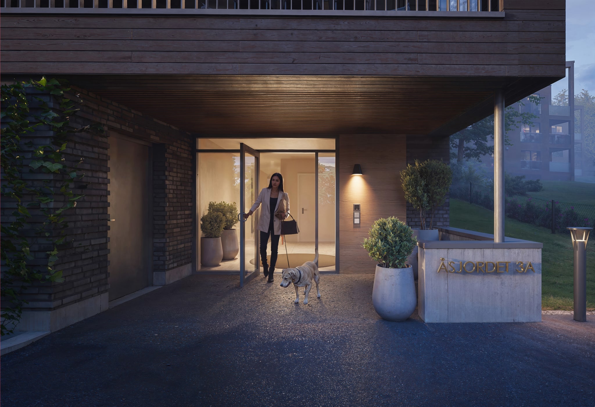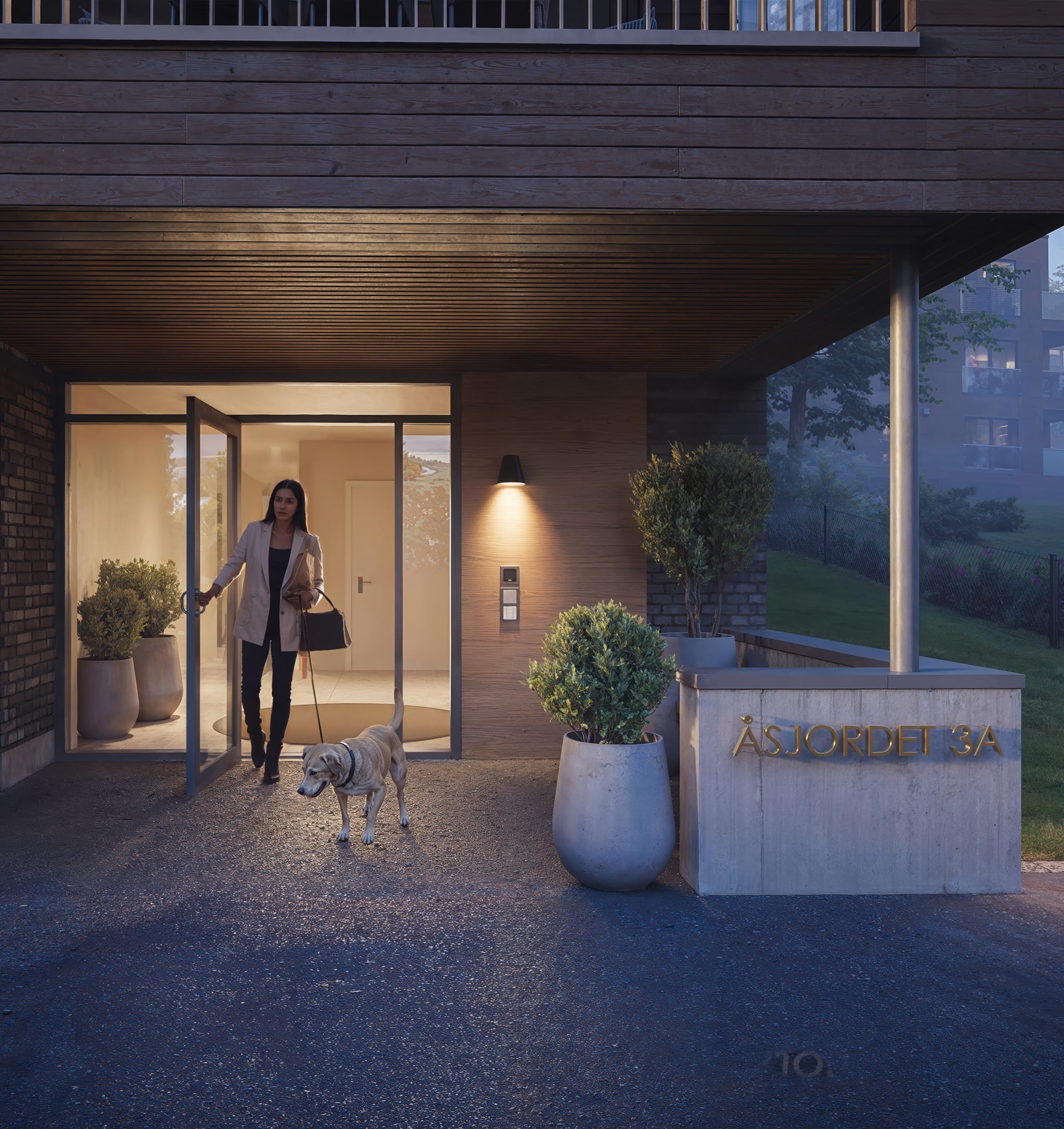 I Åsjordet 3 er det gjennomførte kvaliteter og nøye utvalgte materialer. Her blir du omgitt av materialvalg uten kompromisser, og du møter det allerede når du står på utsiden. Fasaden på byggene er formet av teglstein og treverk i ulike farger, overflater som både passer til omgivelsene og samtidig reflekterer kvaliteten hele prosjektet er preget av.
