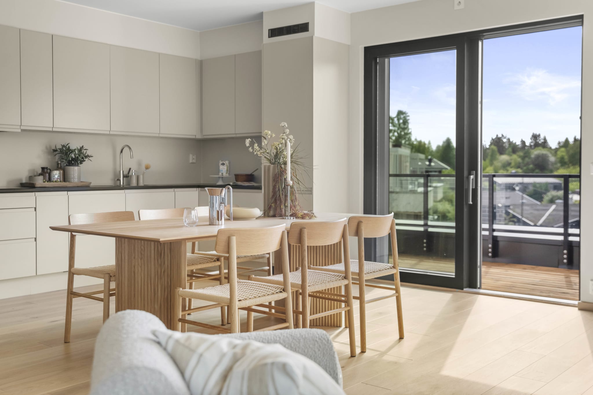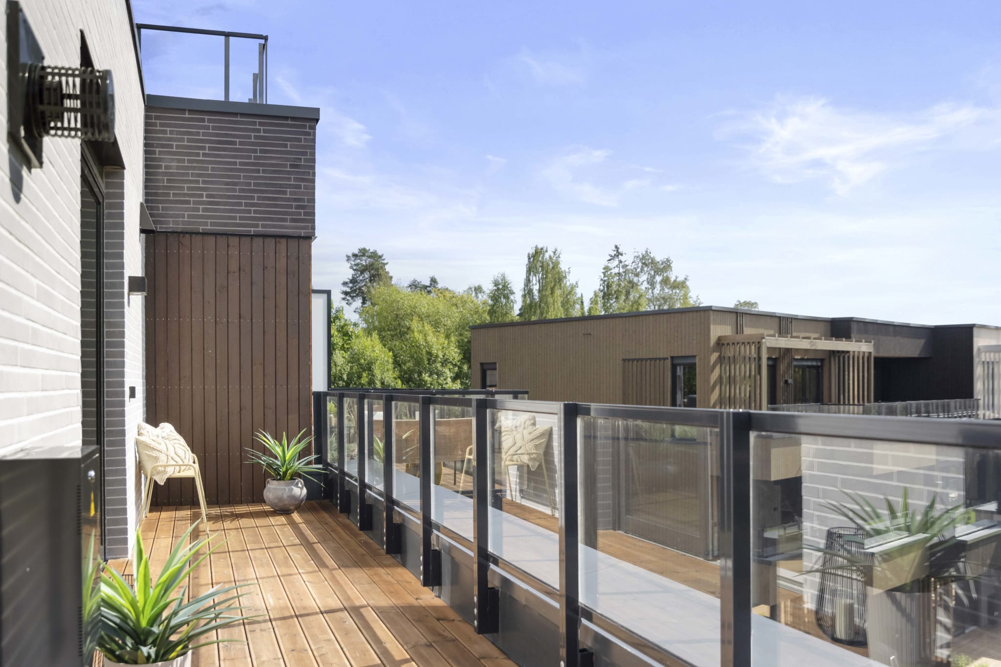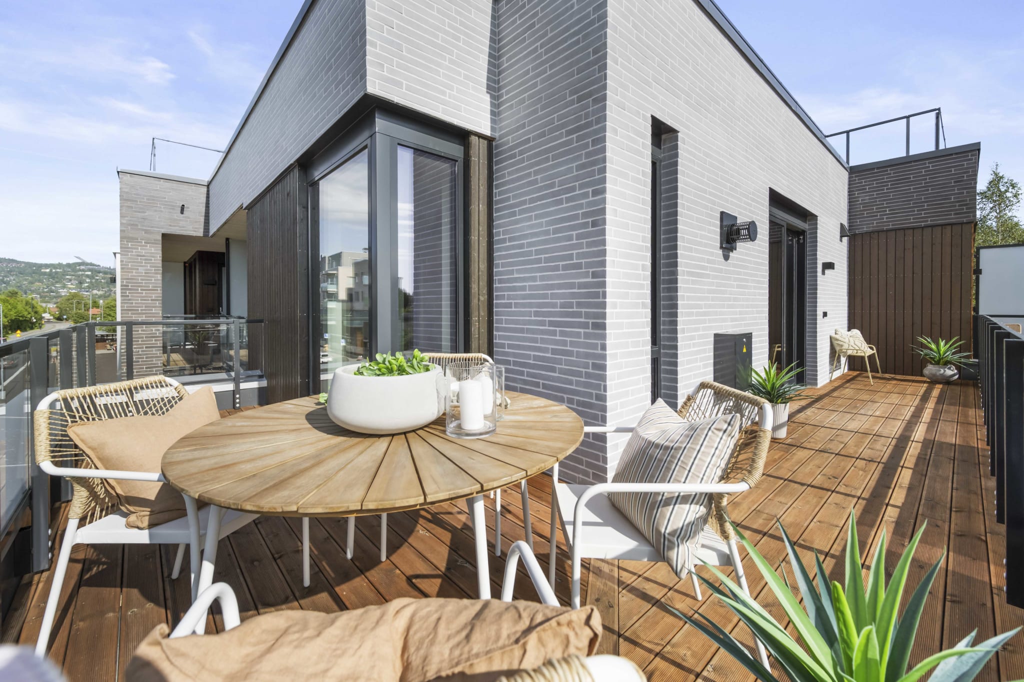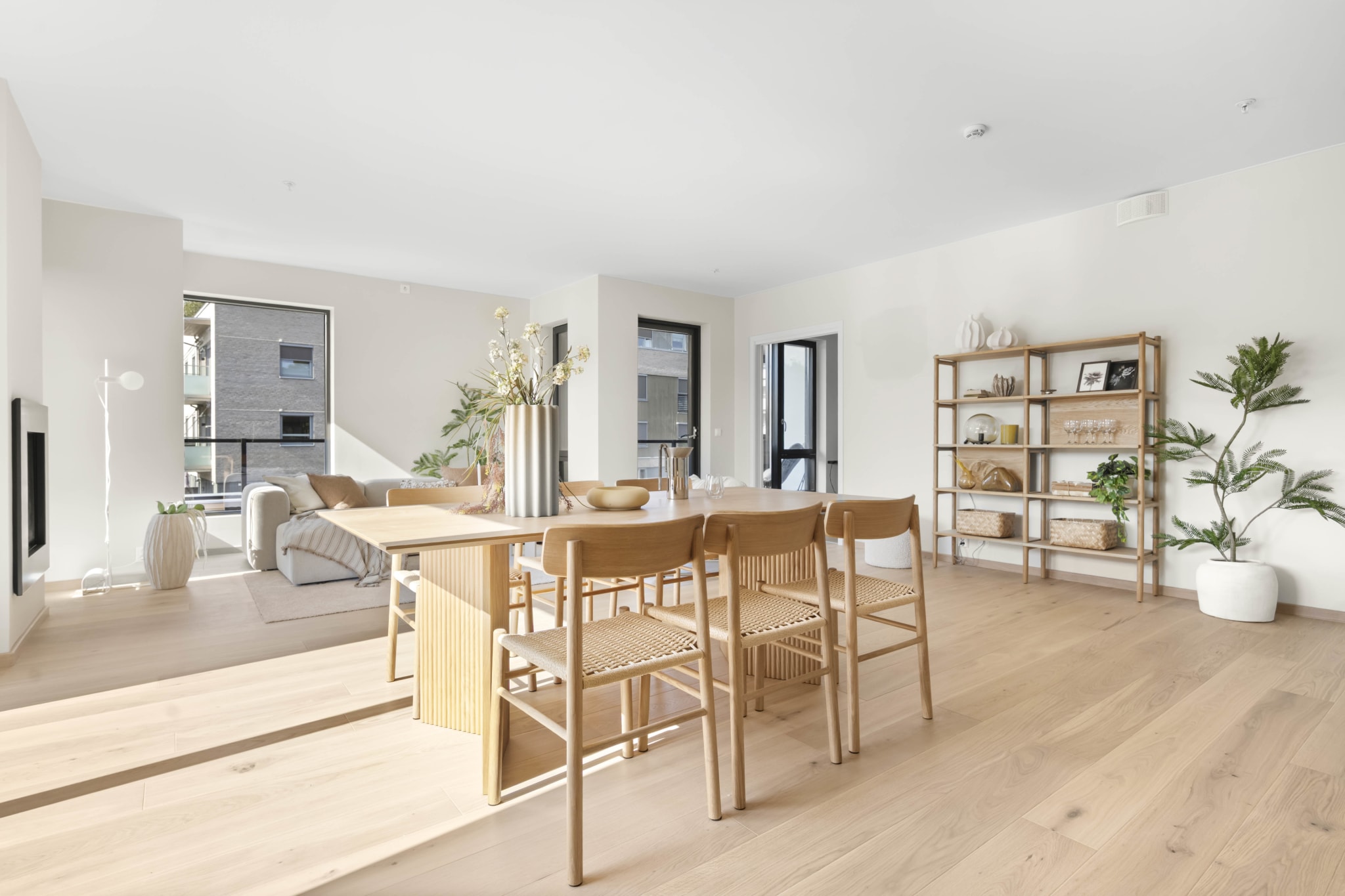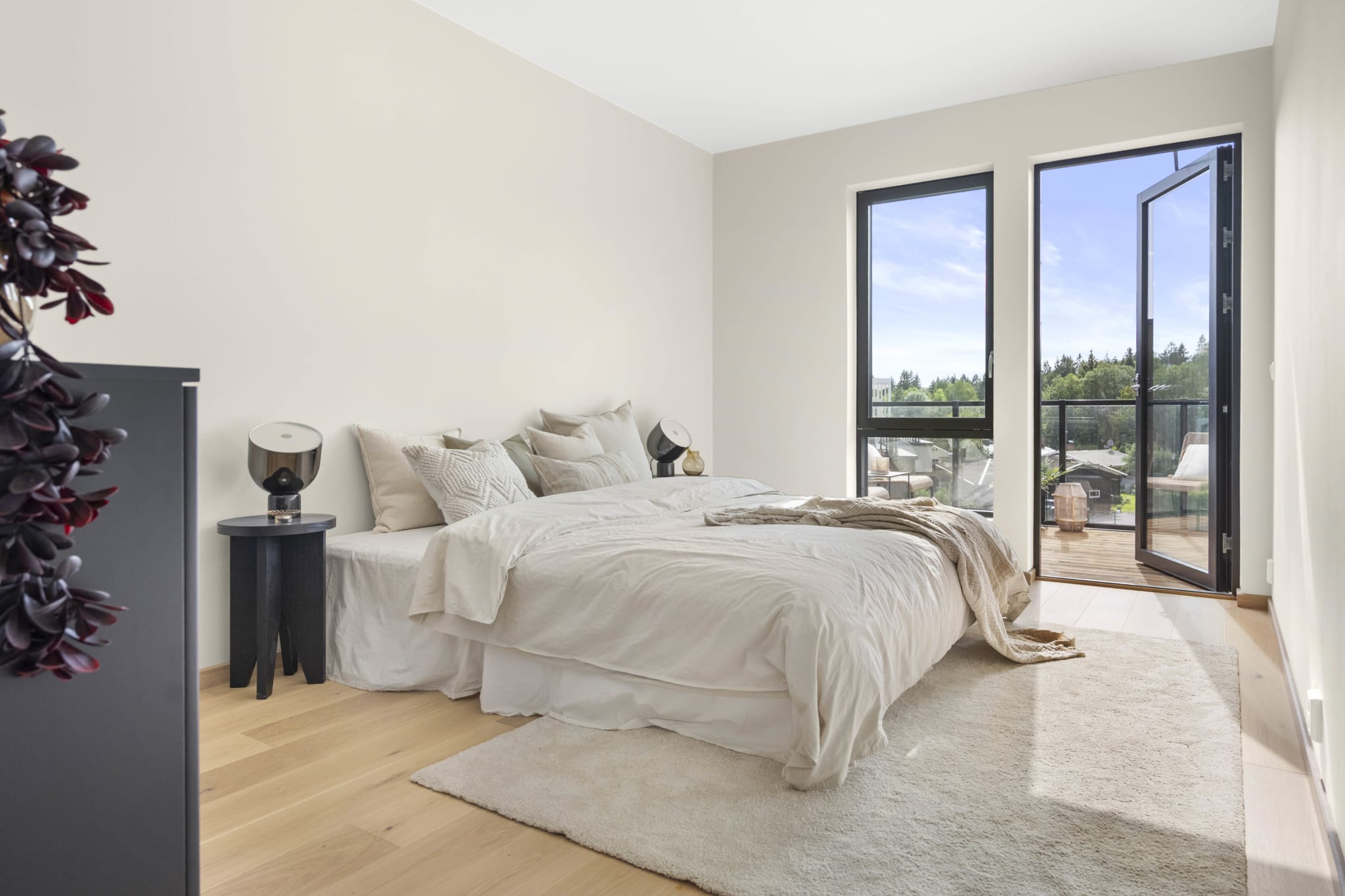 Eksklusiv 4-roms hjørneleilighet med tre store uteplasser, gode solforhold og svært gode kvaliteter. Leiligheten har en privat og vestvendt takterrasse på 21,3 kvm, to balkonger, master soverom med tilhørende walk-in closet og bad, to romslige gjestesoverom med et gjestebad, vaskerom og en stor åpen stue- og kjøkkenløsning med store moderne vinduer som fyller rommet med naturlig lys.