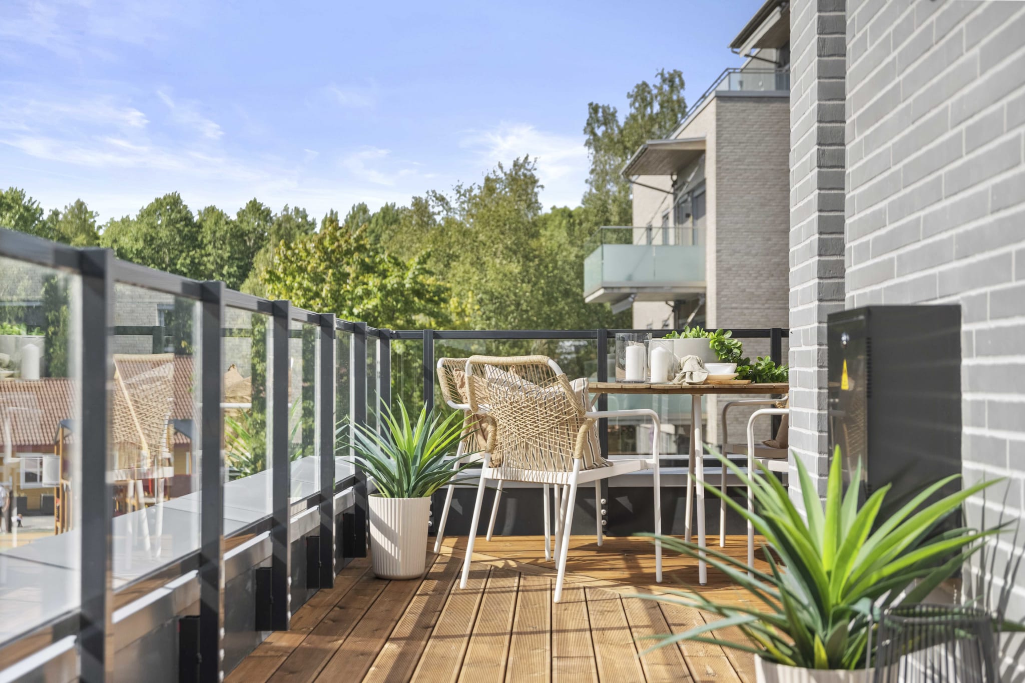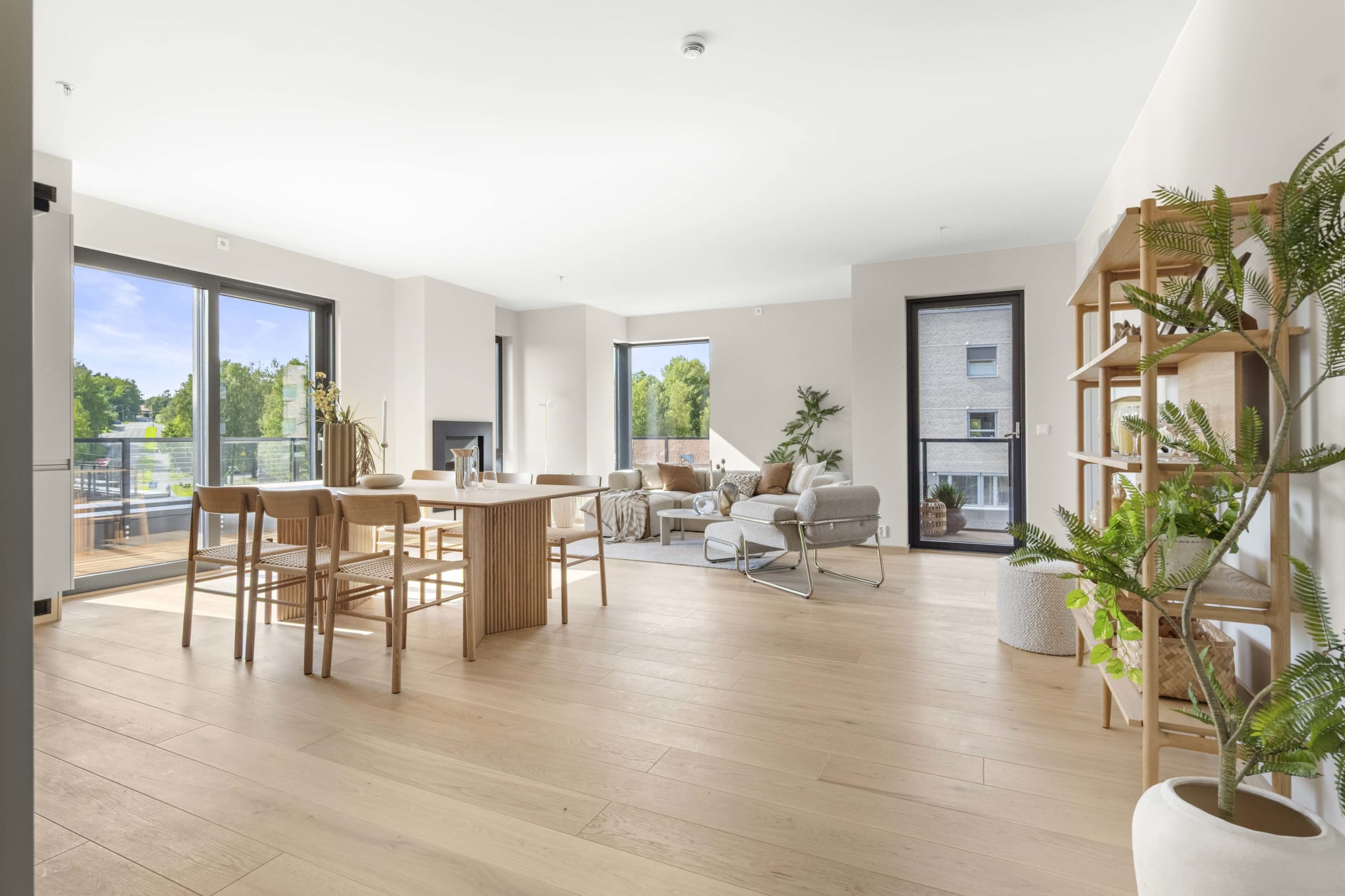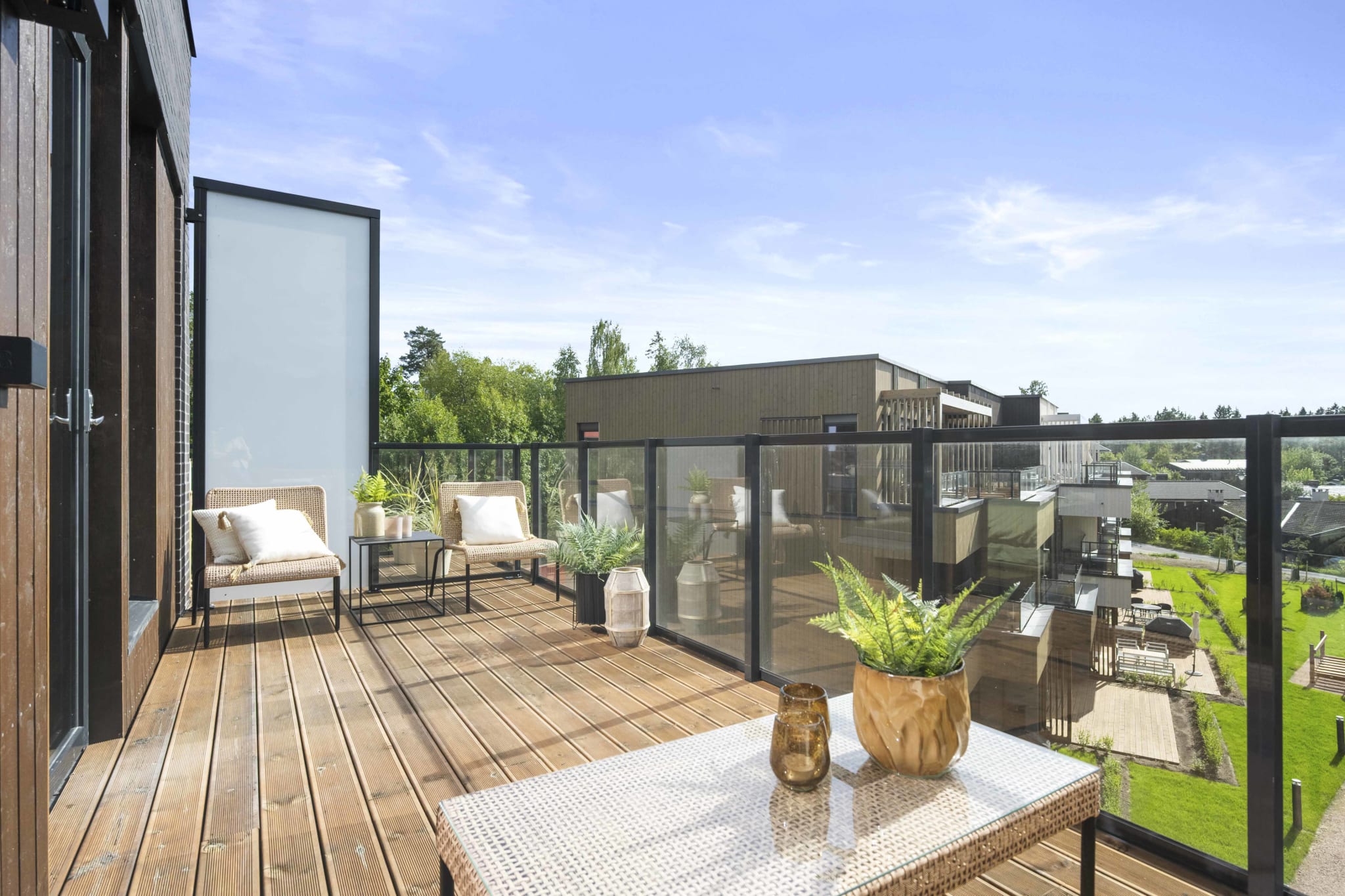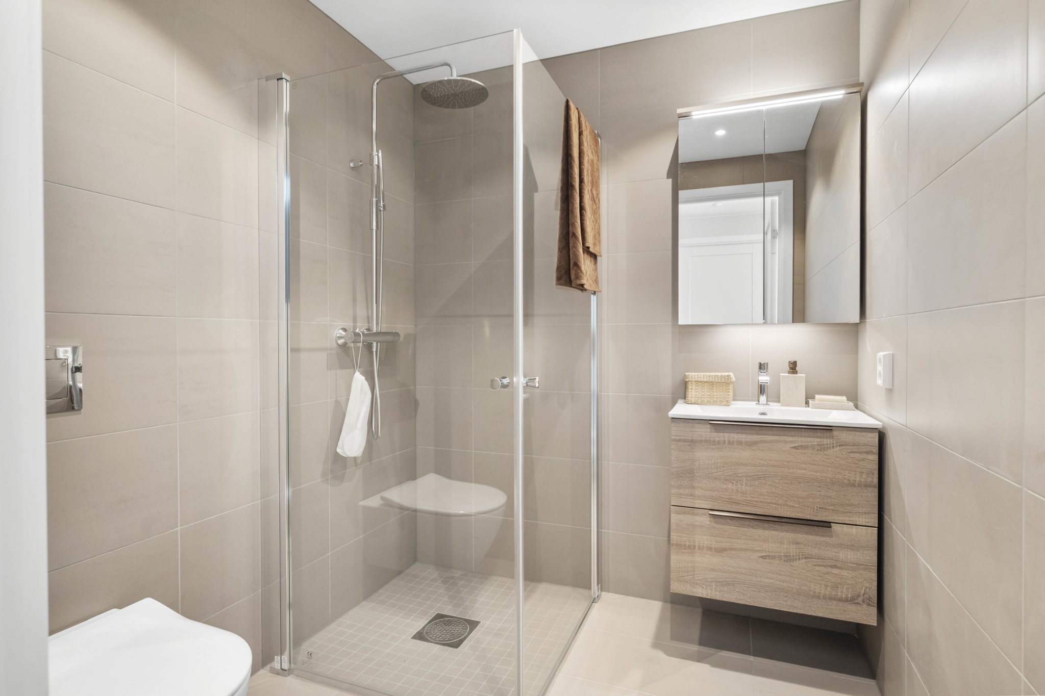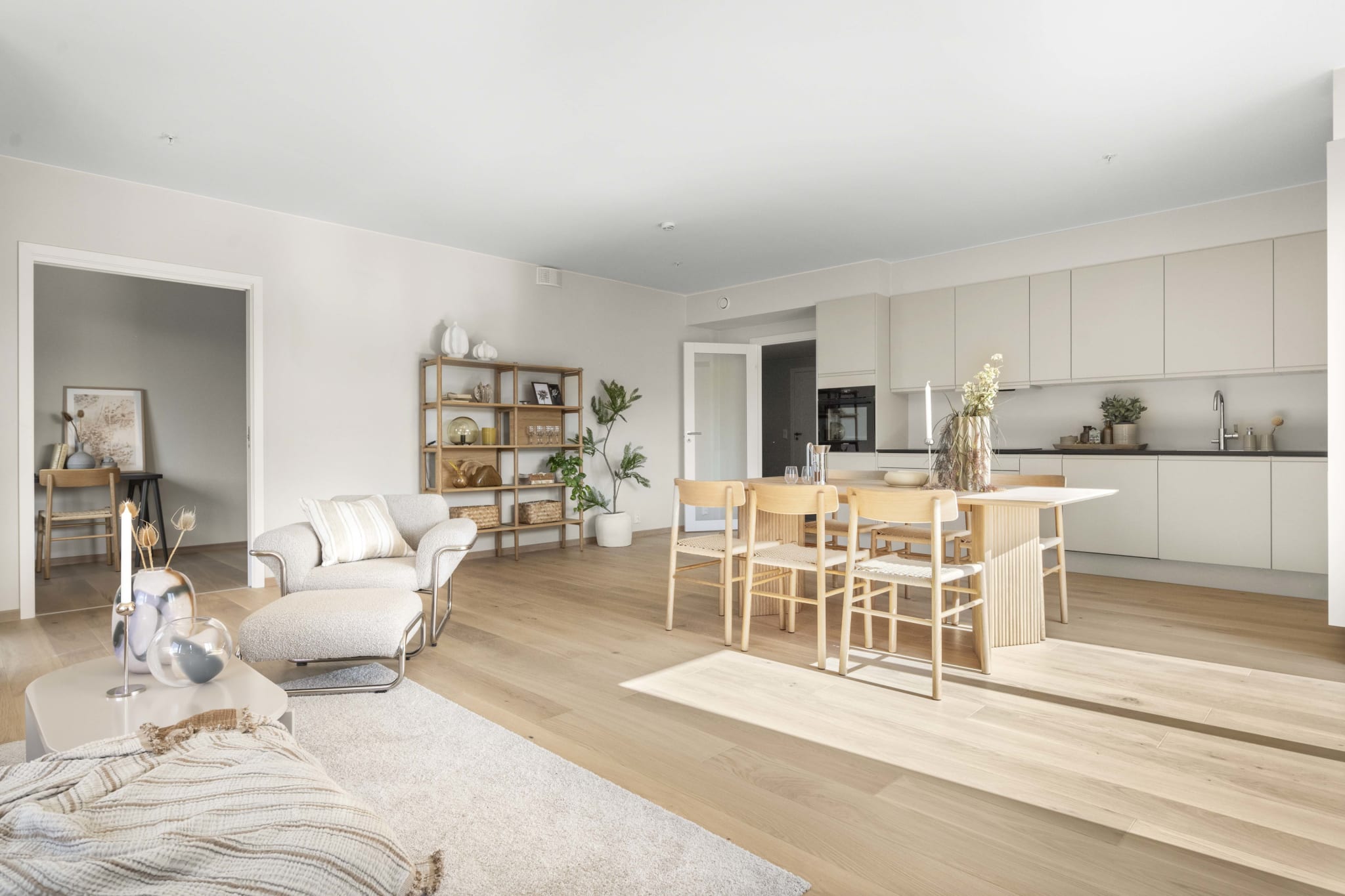 Eksklusiv 4-roms hjørneleilighet med tre store uteplasser, gode solforhold og svært gode kvaliteter. Leiligheten har en privat og vestvendt takterrasse på 21,3 kvm, to balkonger, master soverom med tilhørende walk-in closet og bad, to romslige gjestesoverom med et gjestebad, vaskerom og en stor åpen stue- og kjøkkenløsning med store moderne vinduer som fyller rommet med naturlig lys.
