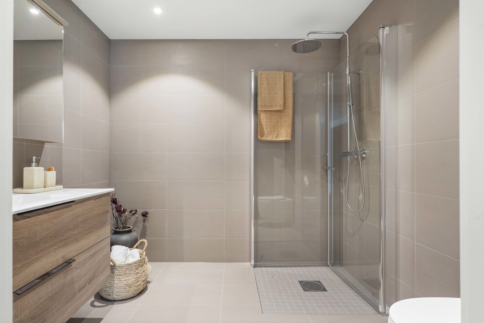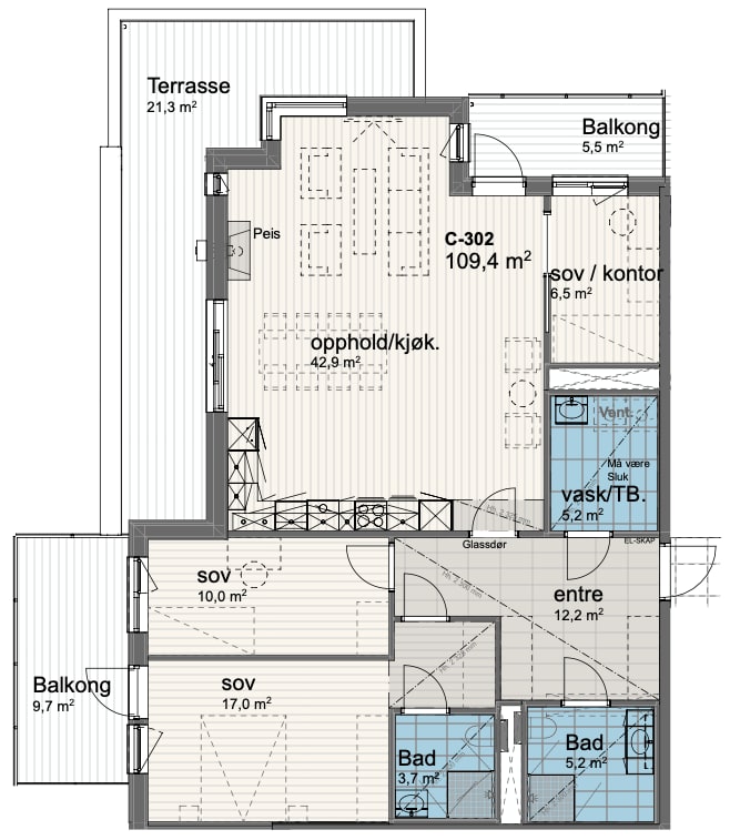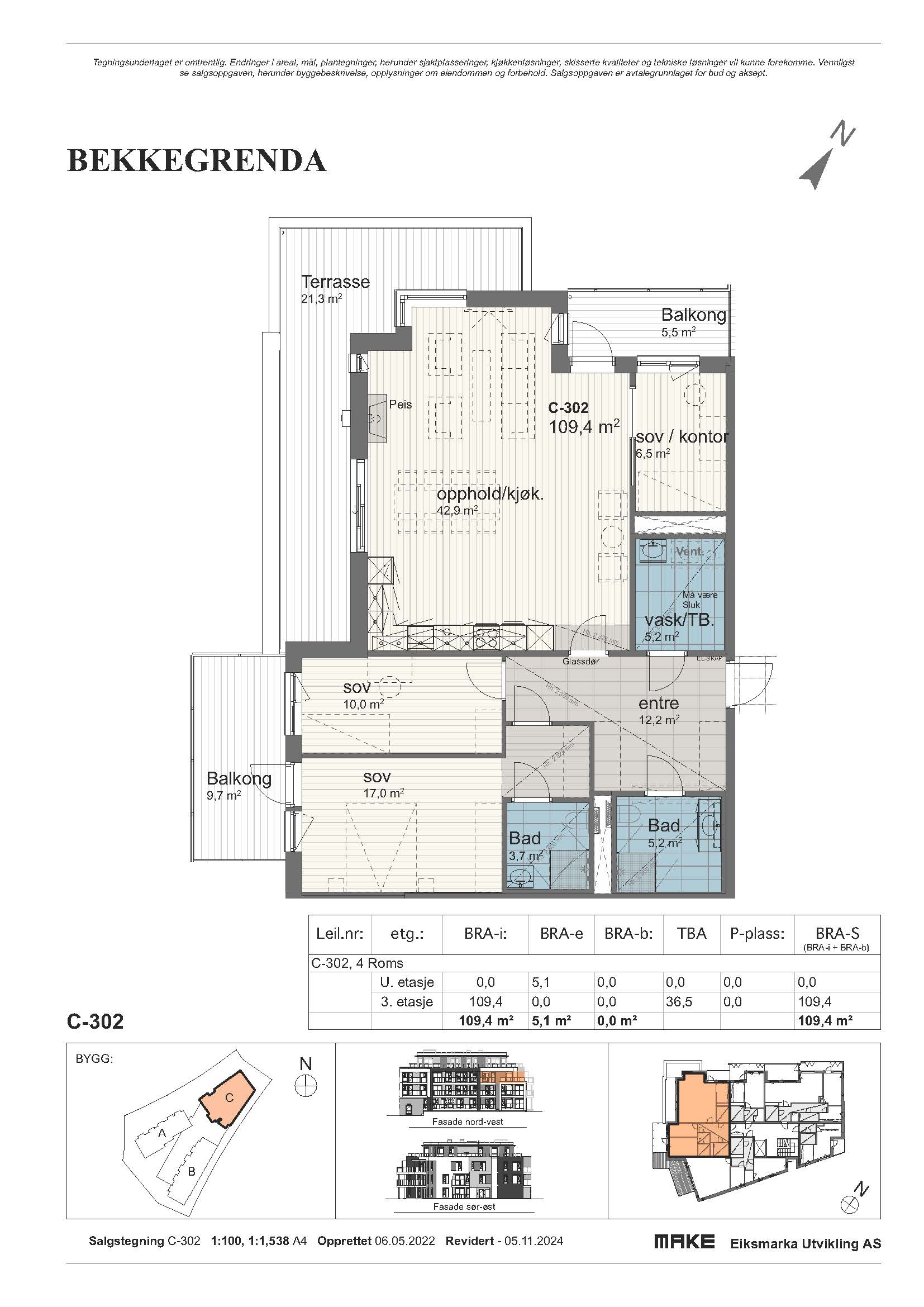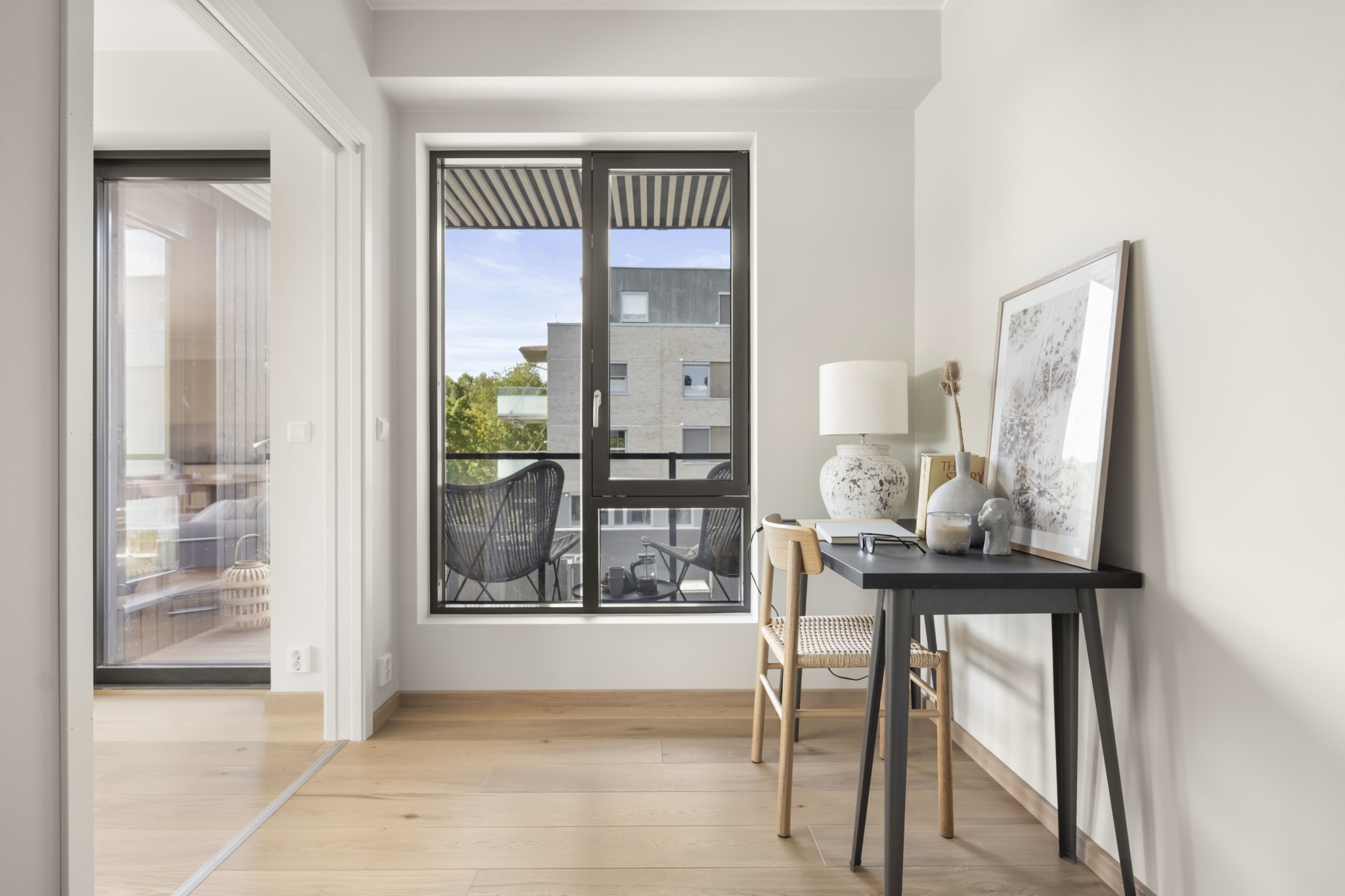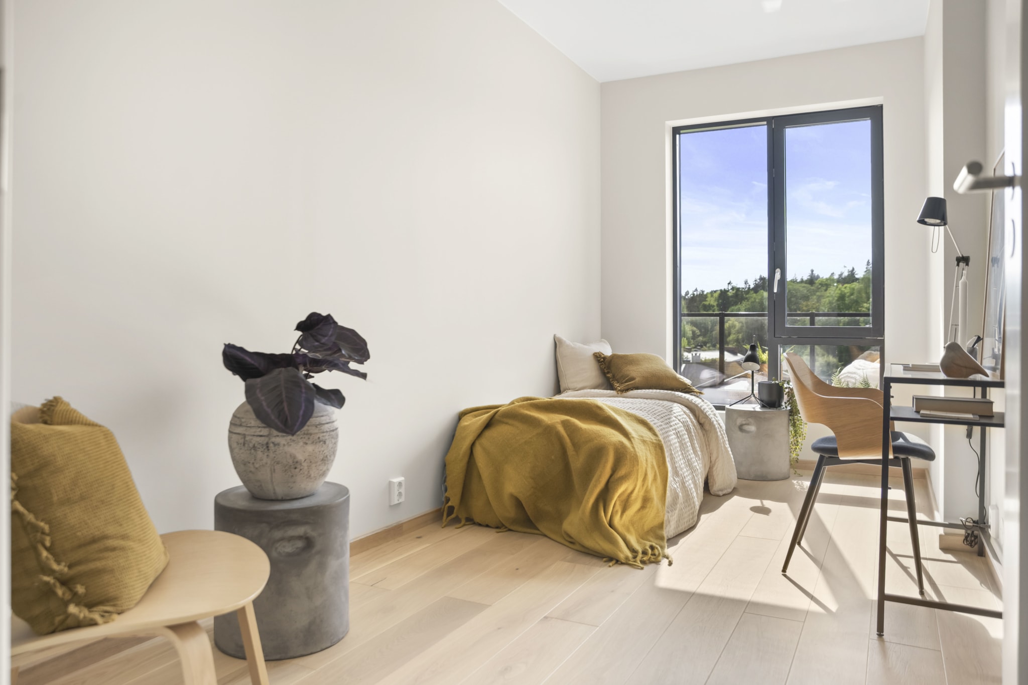 Eksklusiv 4-roms hjørneleilighet med tre store uteplasser, gode solforhold og svært gode kvaliteter. Leiligheten har en privat og vestvendt takterrasse på 21,3 kvm, to balkonger, master soverom med tilhørende walk-in closet og bad, to romslige gjestesoverom med et gjestebad, vaskerom og en stor åpen stue- og kjøkkenløsning med store moderne vinduer som fyller rommet med naturlig lys.