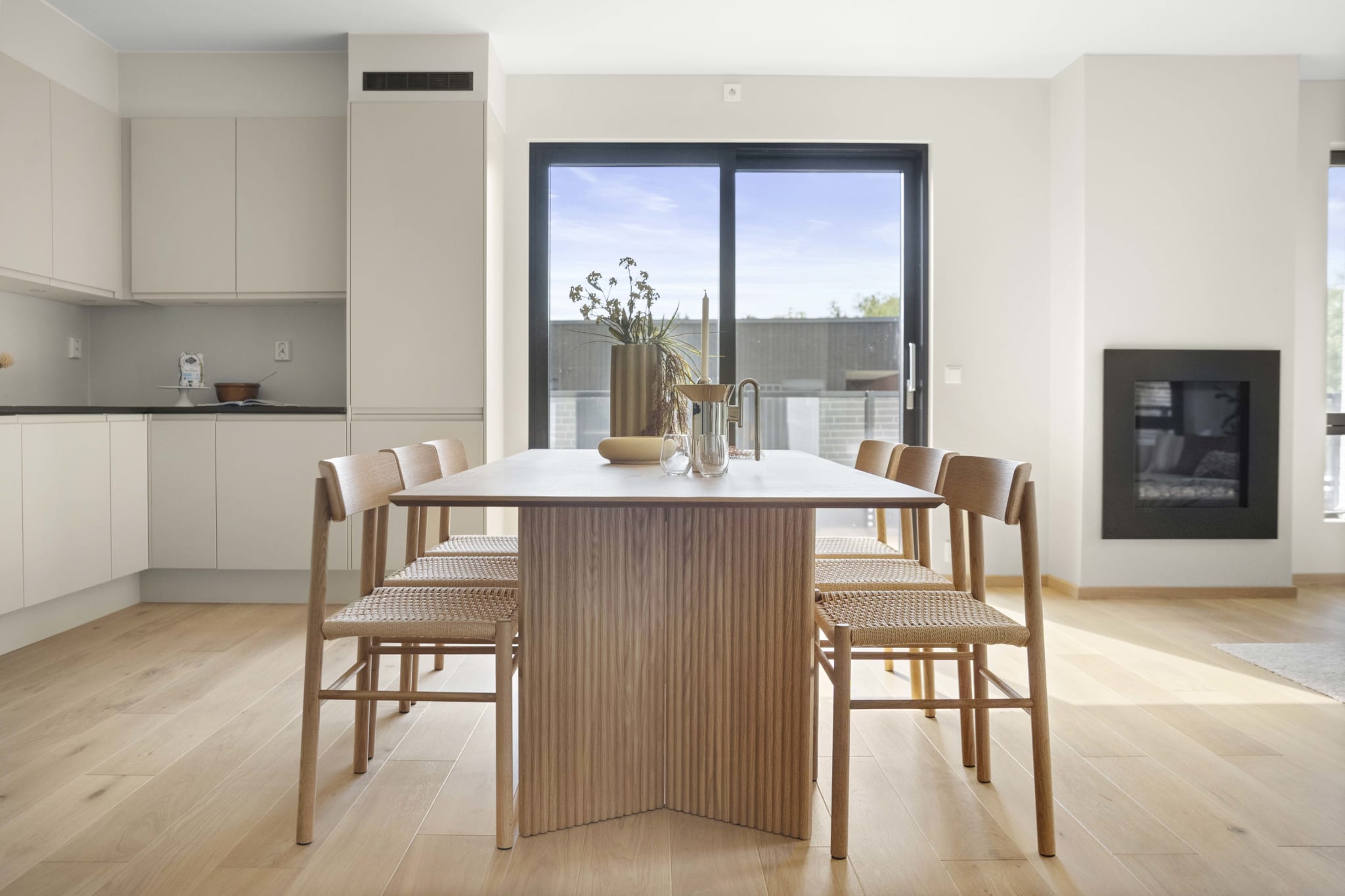 Leiligheten har høy standard med blant annet gasspeis, 1-stavs eikeparkett, vannbåren gulvvarme, Sigdal kjøkkeninnredning, integrerte Siemens hvitevarer og balansert ventilasjon.