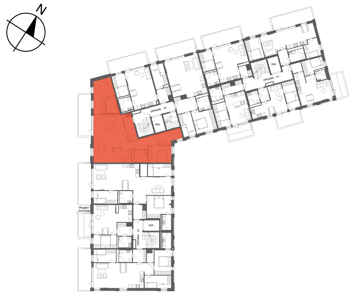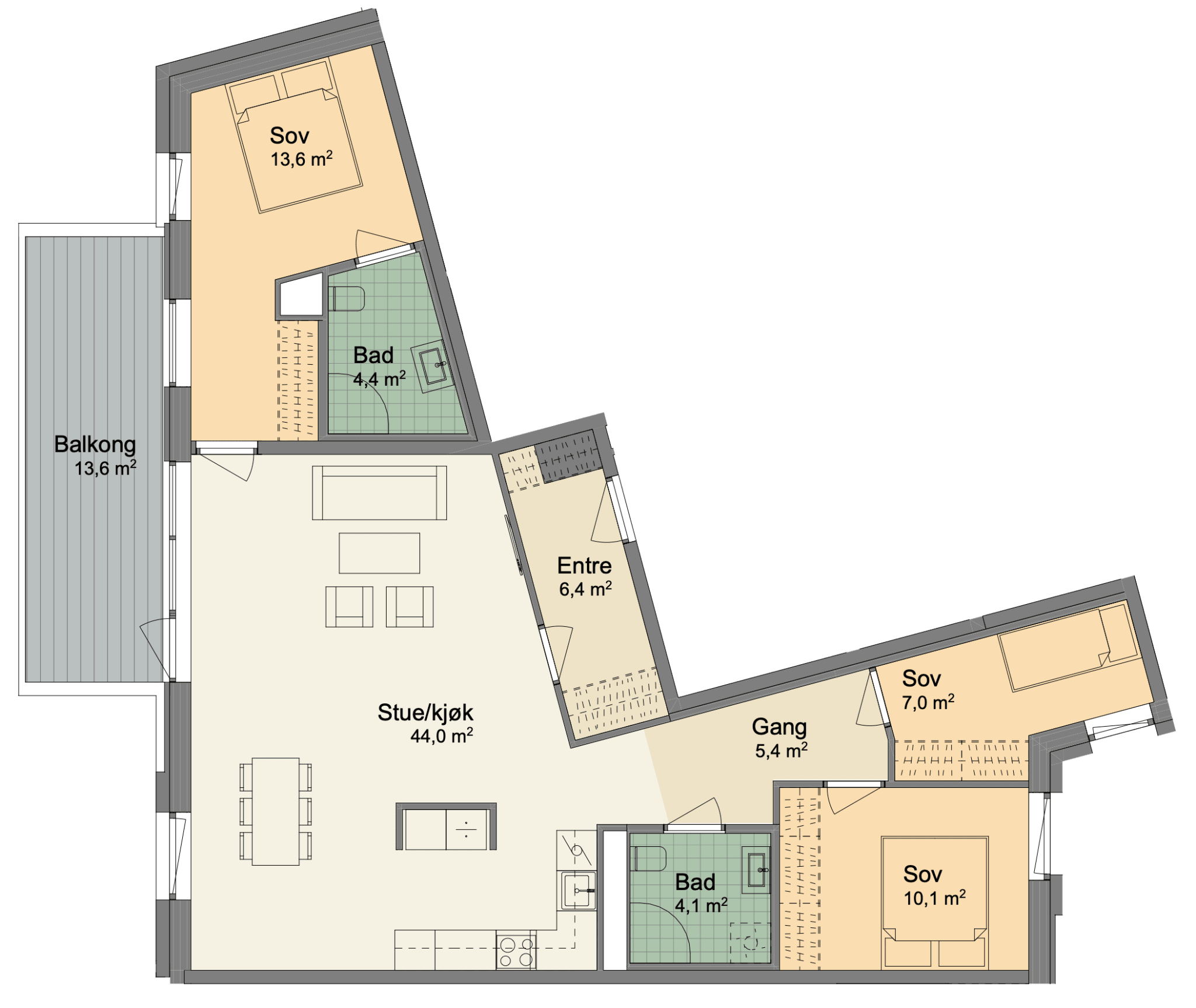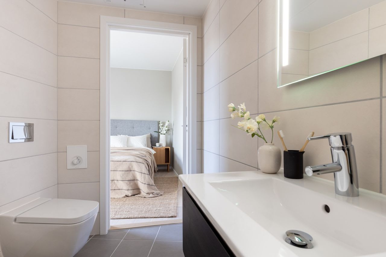 Hovedsoverom med en-suite bad og avsatt plass til garderobeløsning. Stue og kjøkken blir et sosialt rom på hele 44 kvm, med store vindusflater, fine møbleringssoner og utgang til sydvestvendt balkong. Romslig entré og gang i leiligheten, og 1 sportsbod på 5 kvm i underetasjen.