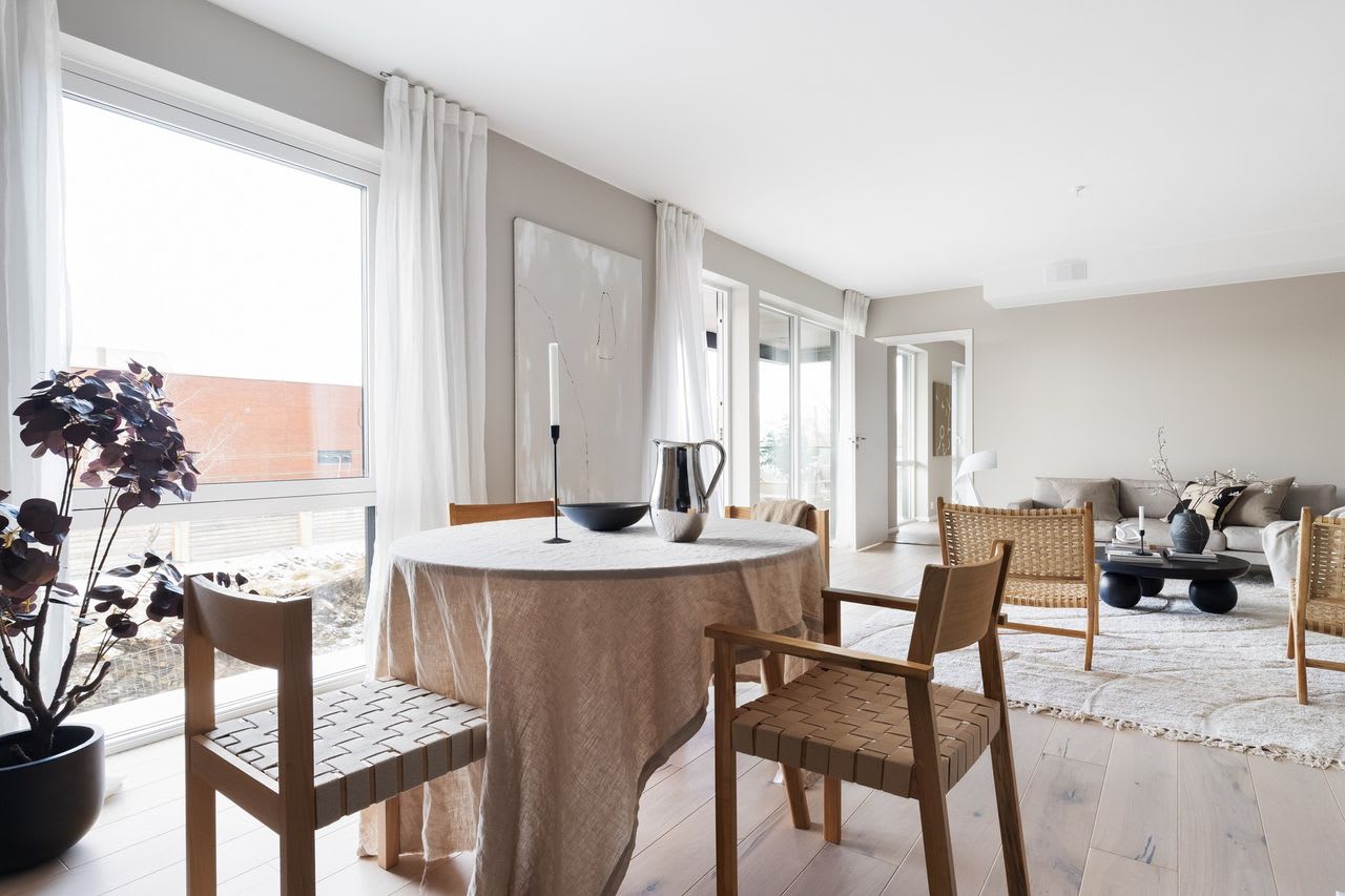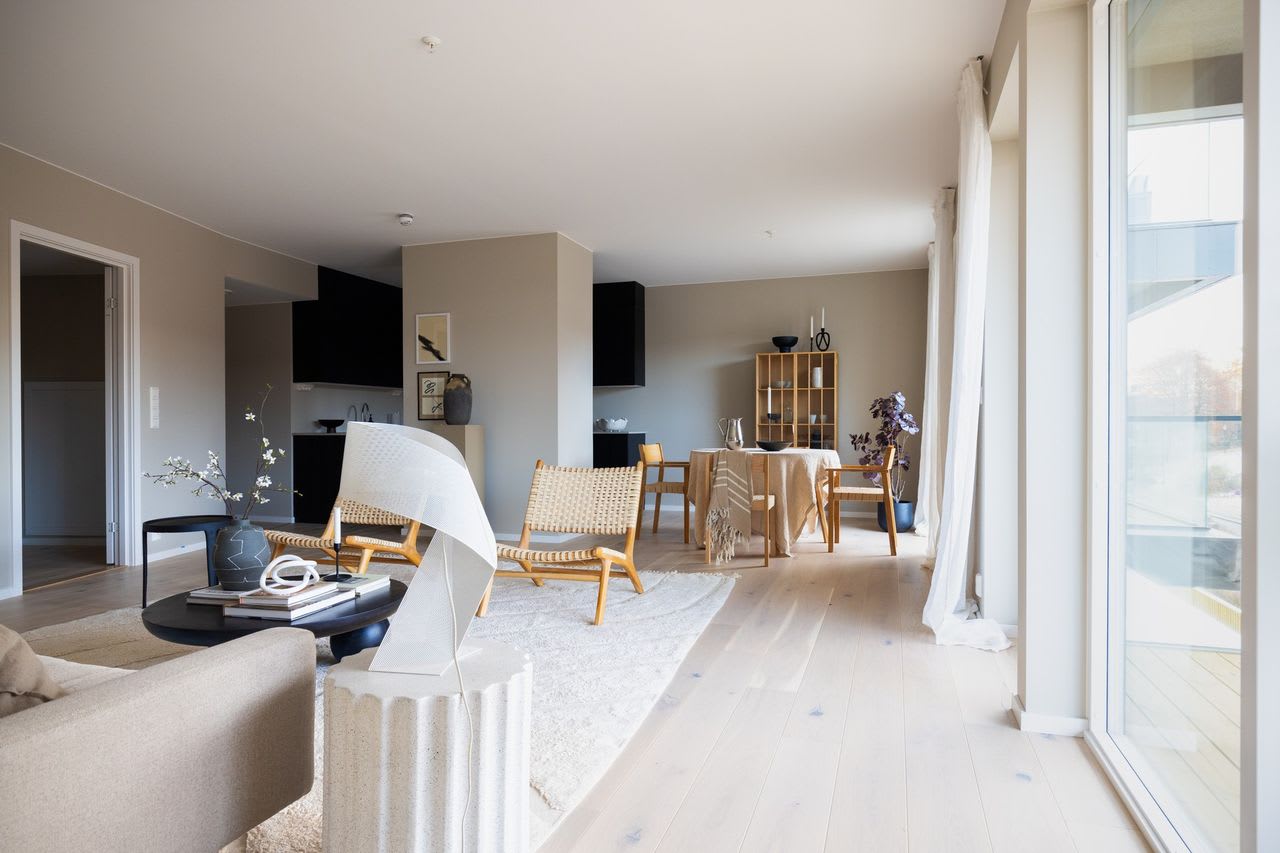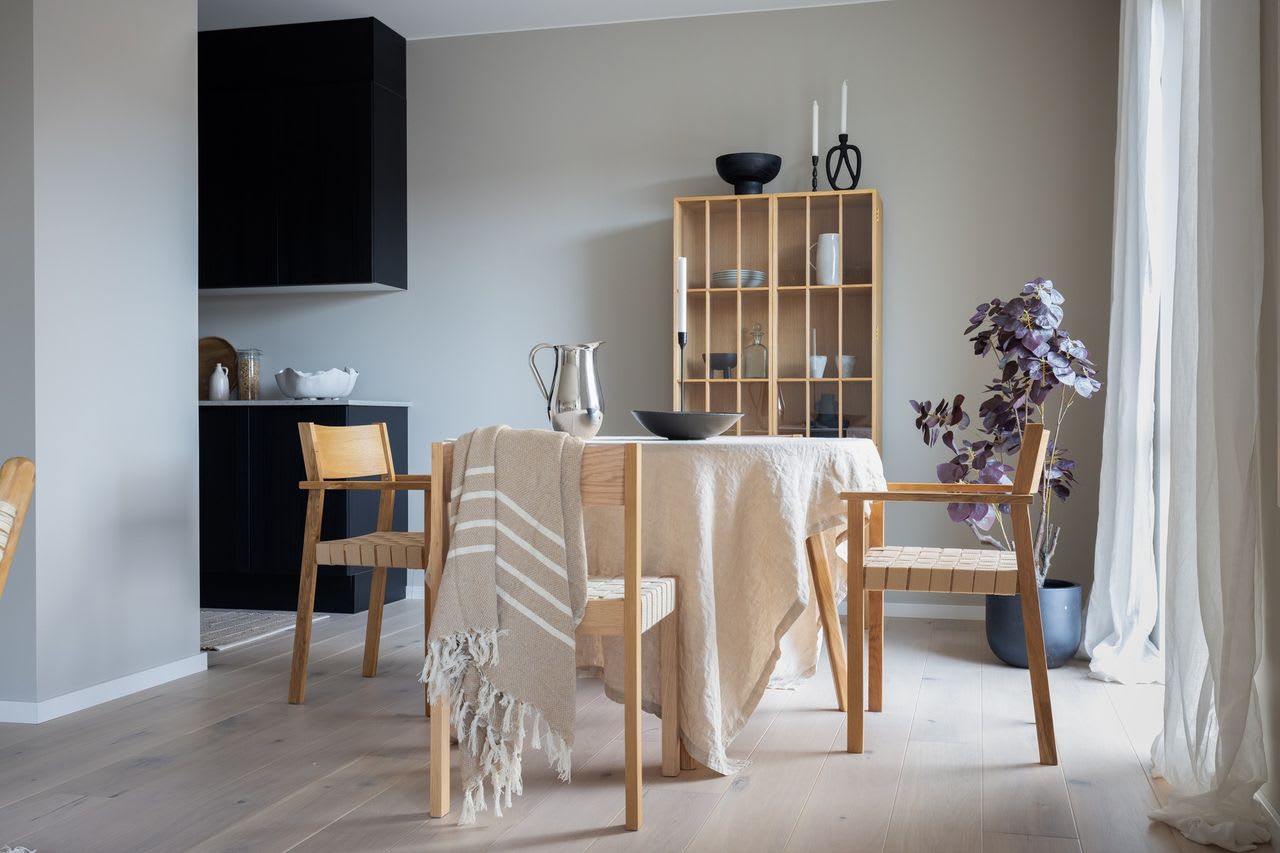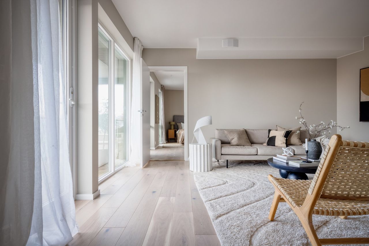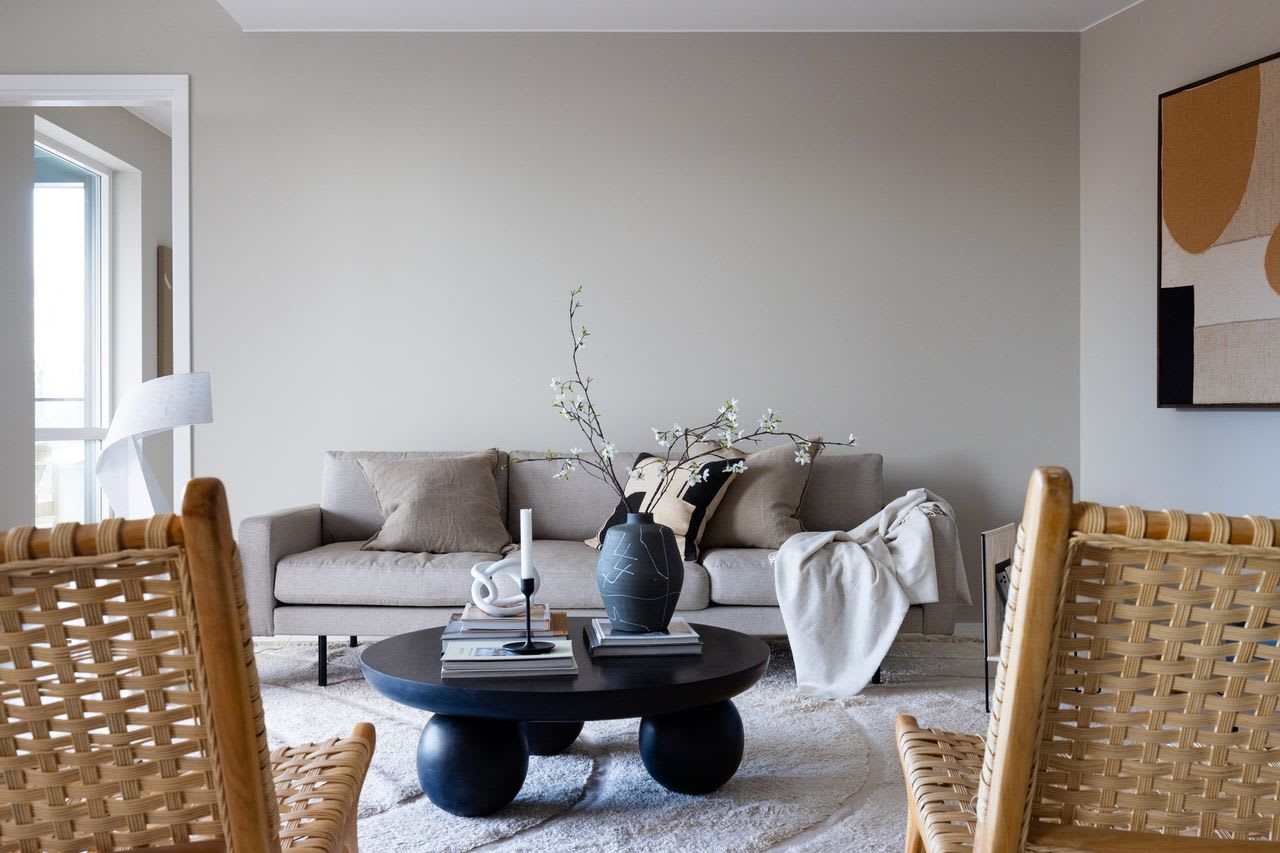En moderne stil med enkle former og stramme linjer som skaper rom for lys, luft og frihet. Varme gråbeige toner kombinert med mørk eik legger fundamentet for dette uttrykket.