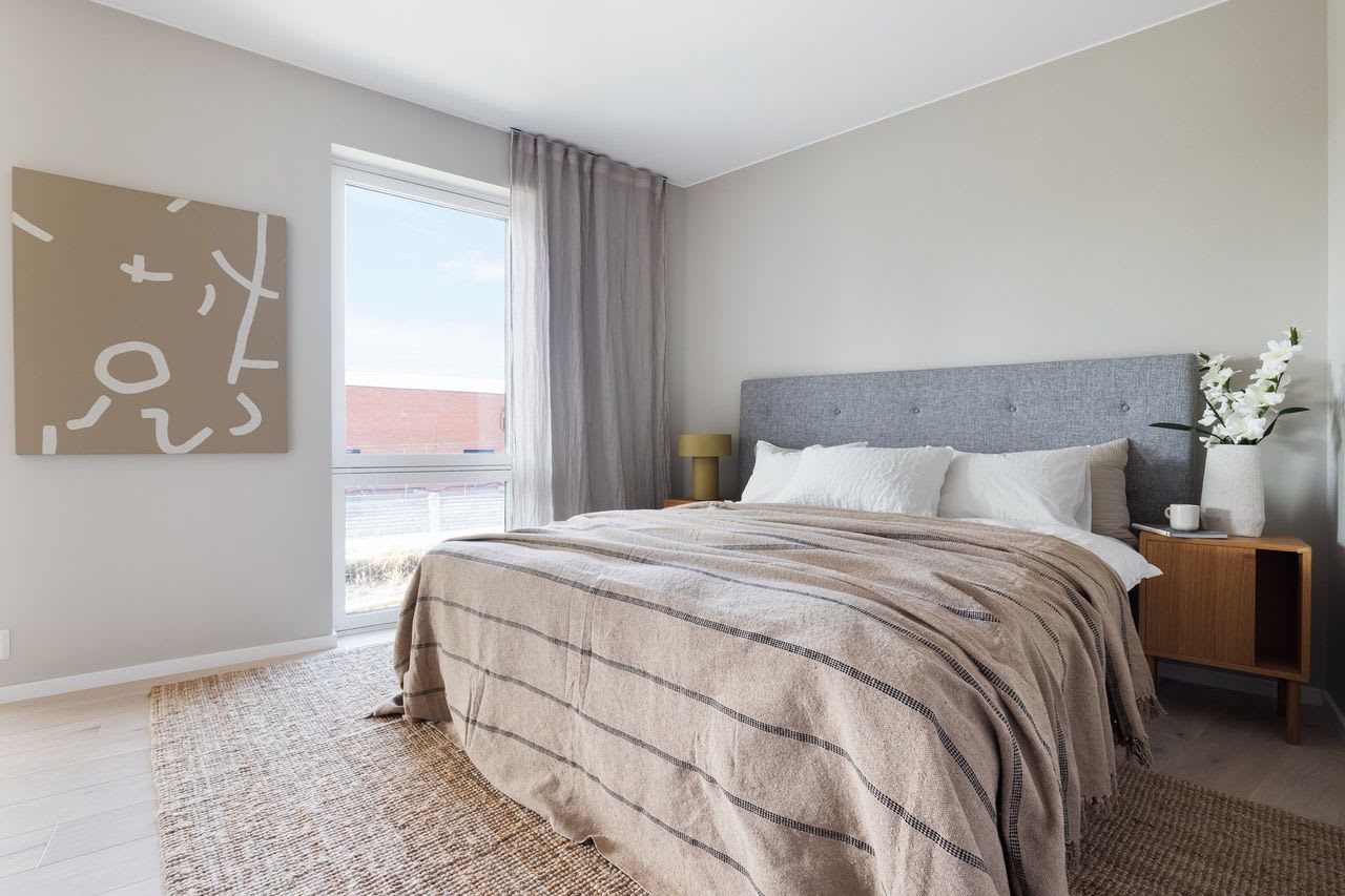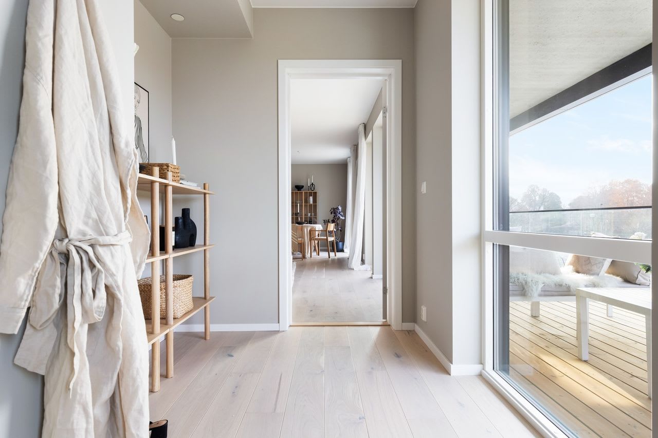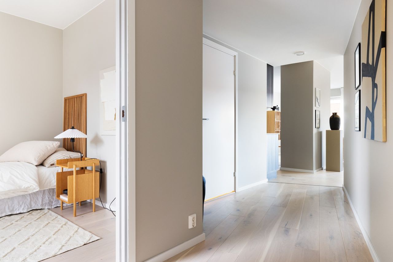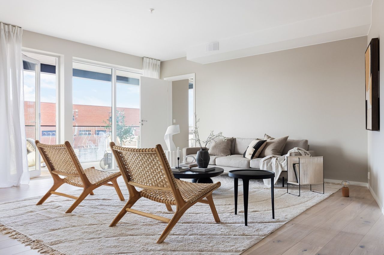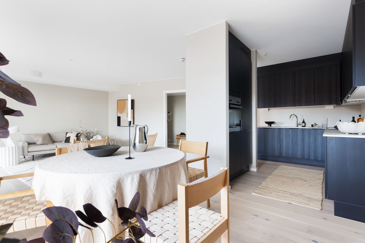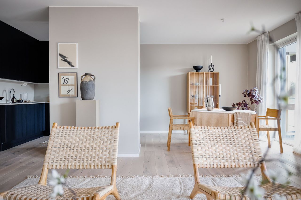 En moderne stil med enkle former og stramme linjer som skaper rom for lys, luft og frihet. Varme gråbeige toner kombinert med mørk eik legger fundamentet for dette uttrykket.