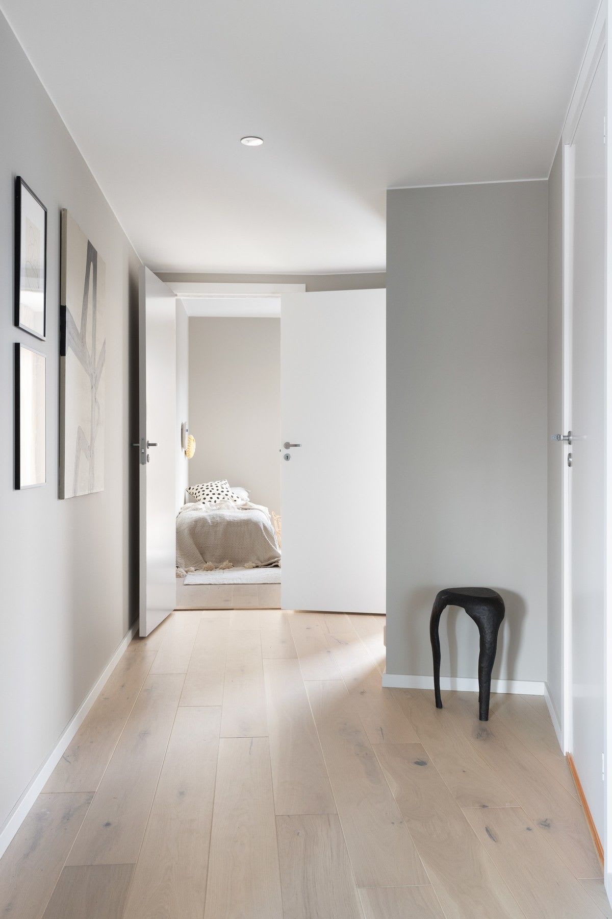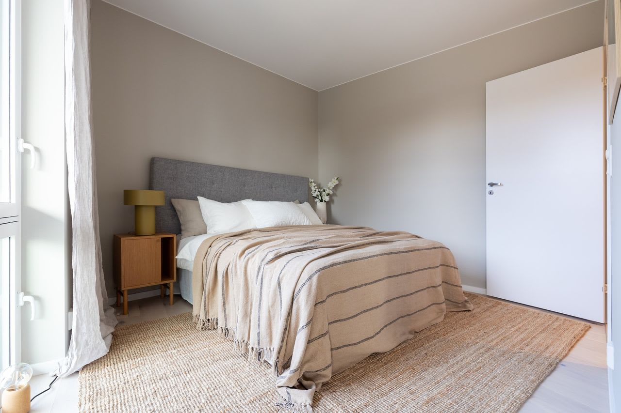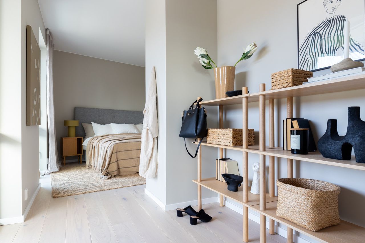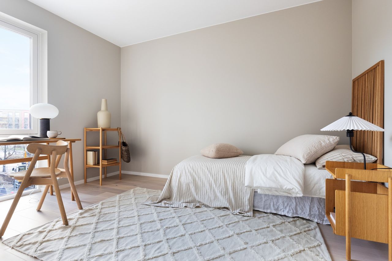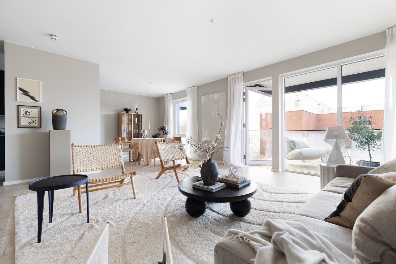 En moderne stil med enkle former og stramme linjer som skaper rom for lys, luft og frihet. Varme gråbeige toner kombinert med mørk eik legger fundamentet for dette uttrykket.