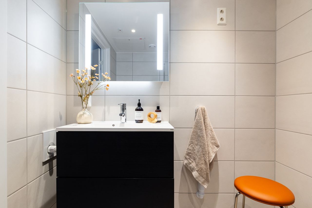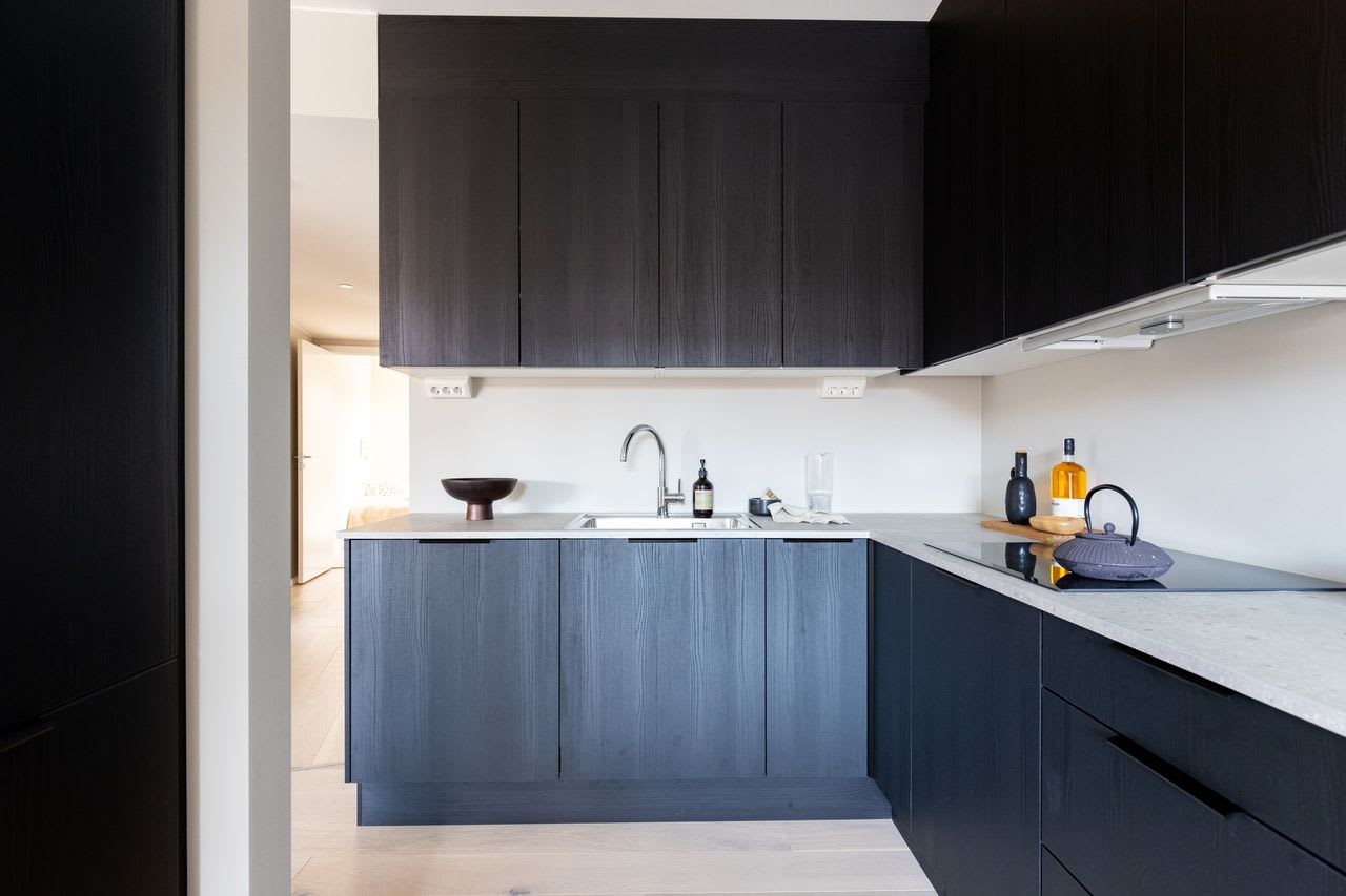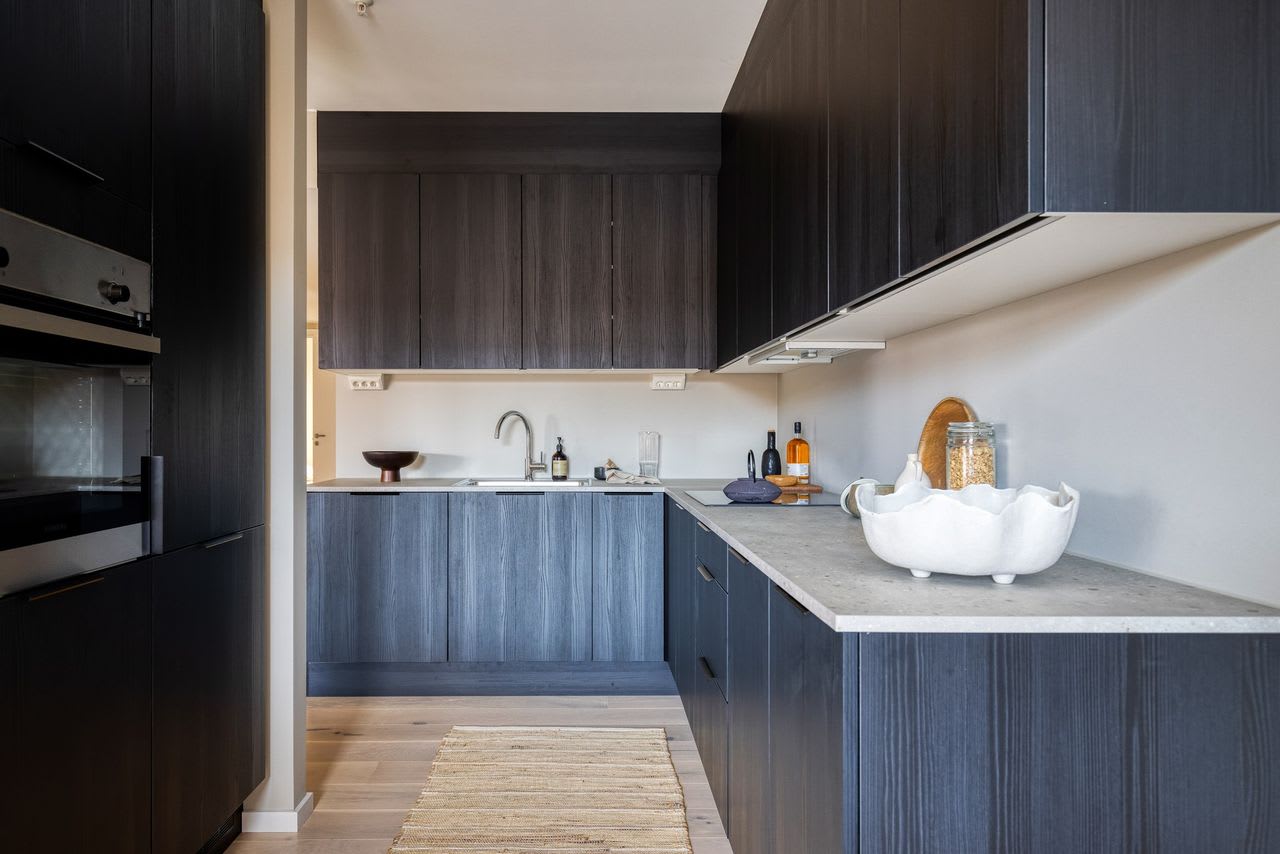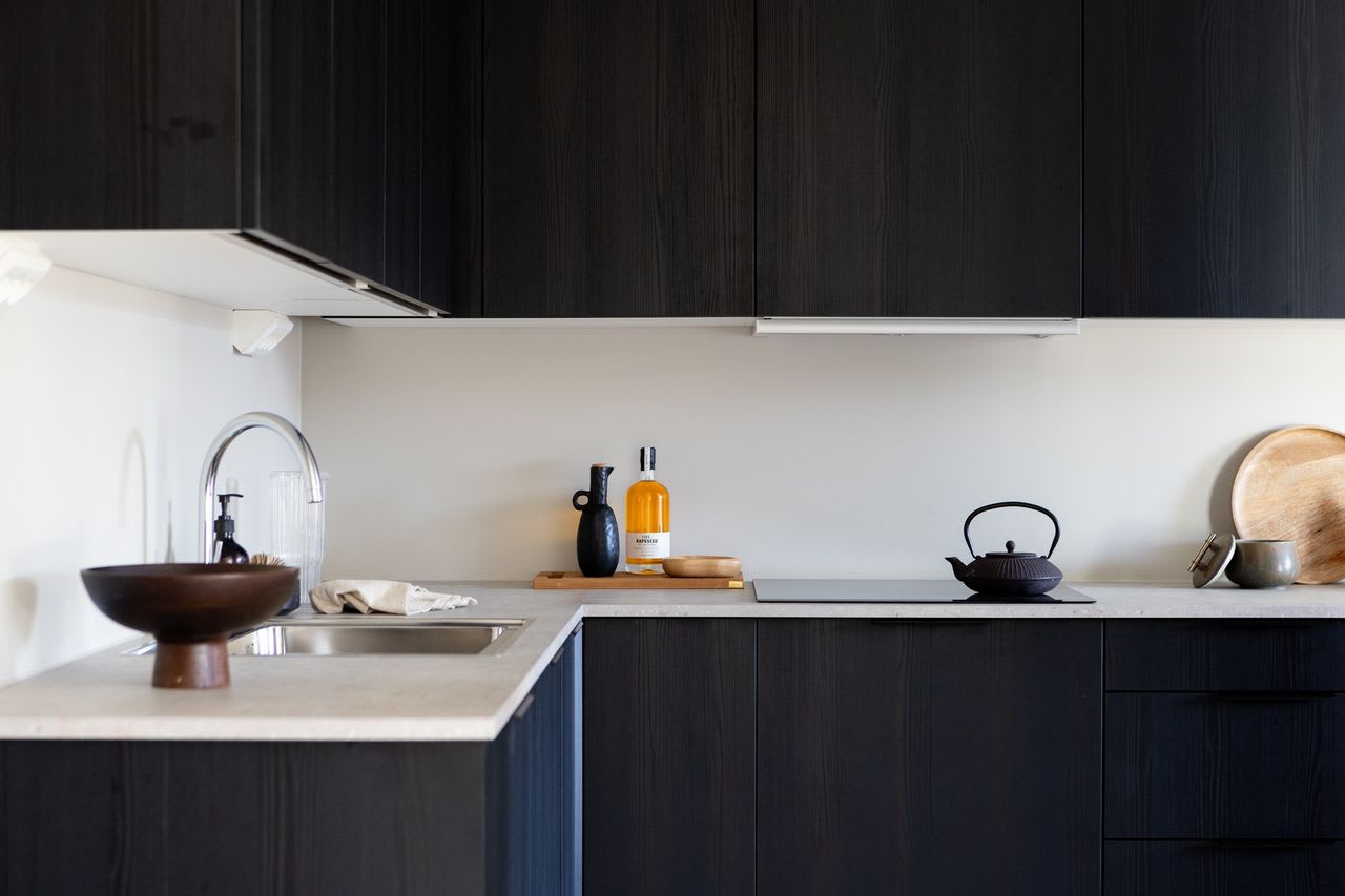 Materialvalg: Kjøkkenfront One i sort eikestruktur. Benkeplate, 20 mm Sandstone laminat. Hvitpigmentert 1-stavs parkett på gulv. Fliser i lys, varm tone på badet.