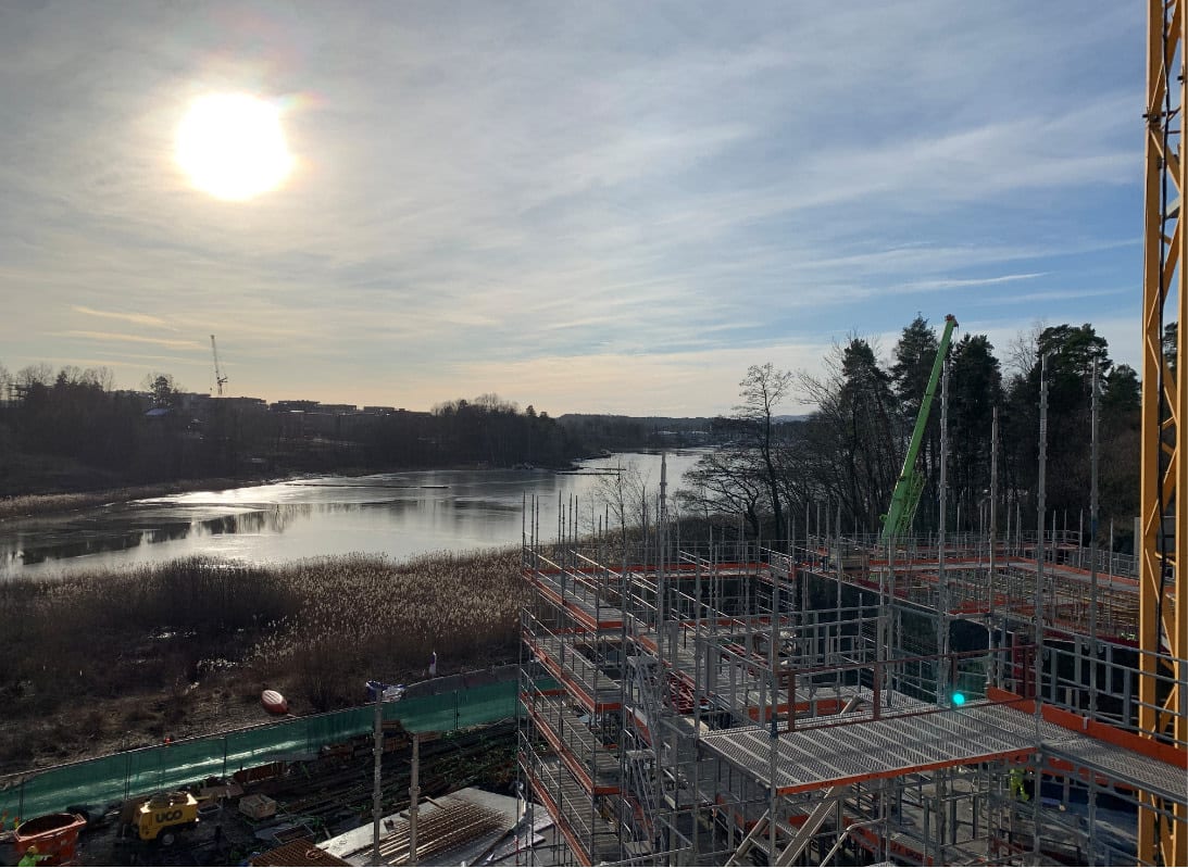 Se på dette herlige bildet tatt fra takterrassen i bygg B, vårfølelsen sprer seg og utsikten er bare å nyte. Råbygget for bygg A og bygg B er ferdigstilt, og det jobbes nå med råbygget for bygg C og D. I bygg A jobbes det med gipsing av innvendige vegger og tekniske føringer, i bygg B pågår arbeid med montering av delevegger. Vi har begynt å jobbe med omlegging av veien og det planlegges at denne skal være ferdig før påske. Omlegging av overvannshåndtering er straks ferdig.