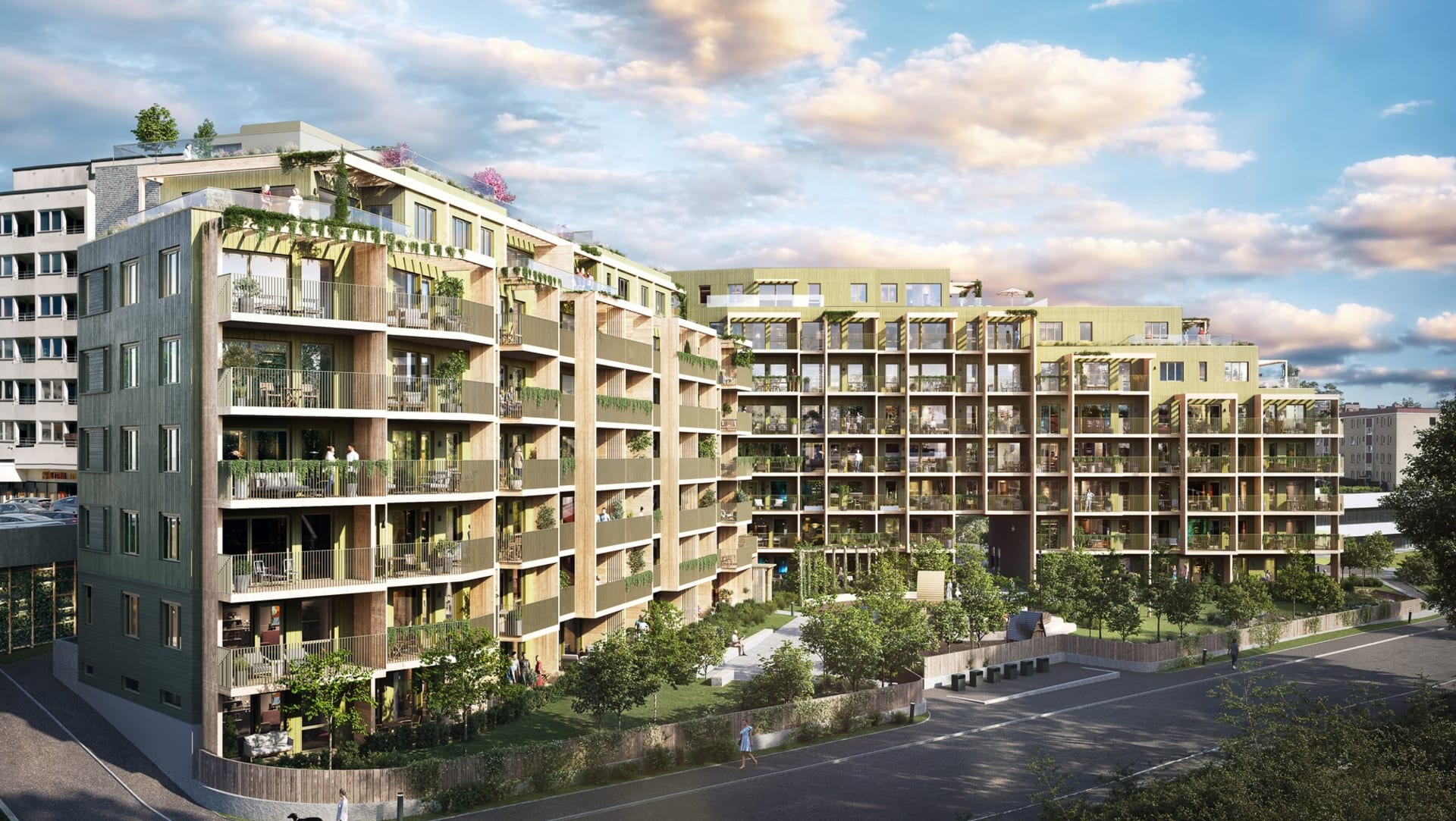 Bebyggelsen består av to bygg i 5–8 etasjer, kledd i naturlige og varige materialer som beiset tre og tegl. Mot gårdsrommet benyttes kun trekledning i varme nyanser og ulike retninger, som gir en myk, organisk karakter. Balkongene fremstår som lette, påhengte strukturer med synlig bærekonstruksjon i tre. De kles i naturfarget treverk, og rekkverkene får åpne, diagonale spiler i grønntone – en detalj som spiller på landskapets farger og gir liv og rytme til fasaden.