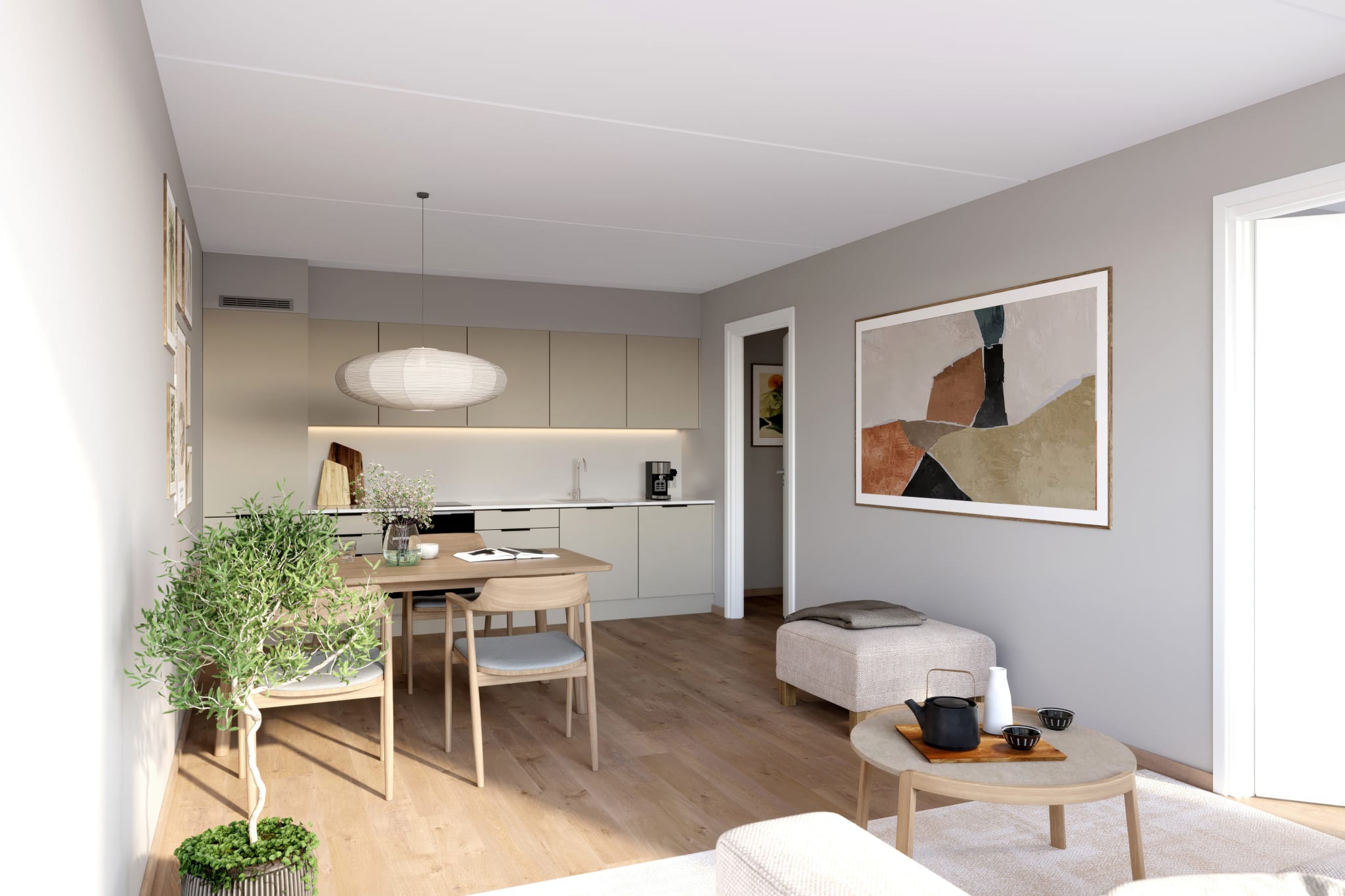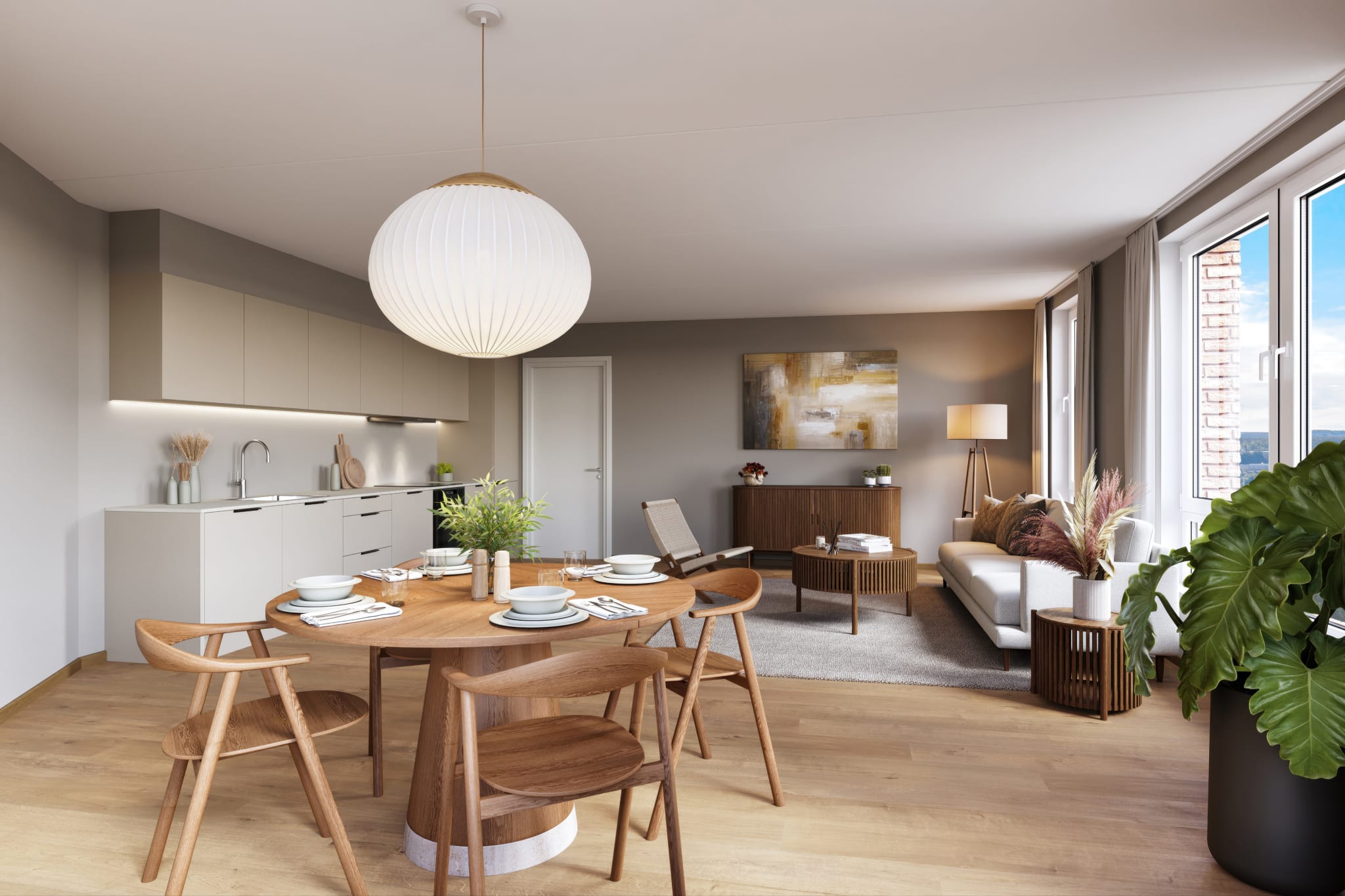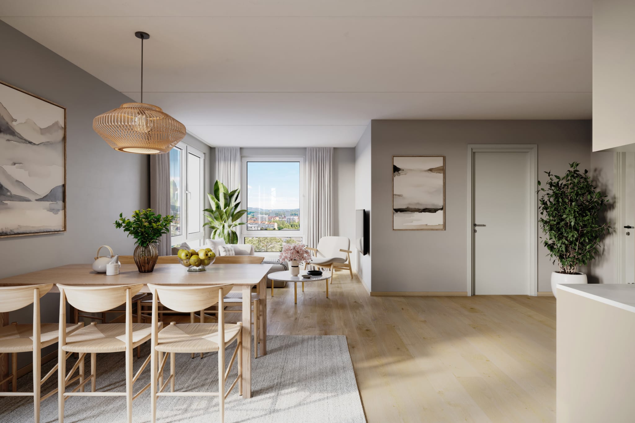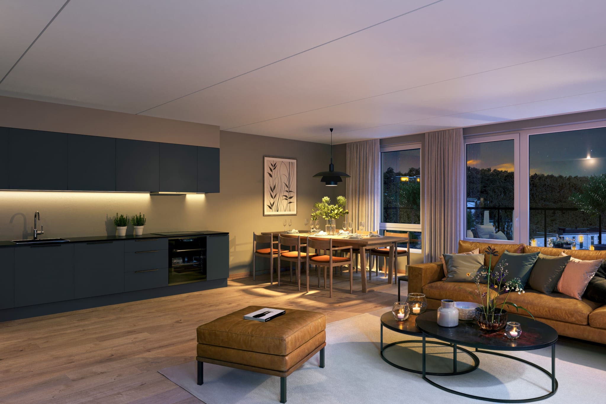 Velg: Klikk på de grønne tekstfeltene for å navigere deg rundt i Libakkløkka, mellom leiligheter og takterrassen. For å navigere deg tilbake klikker du på tilbakepilen under boligmodellen.