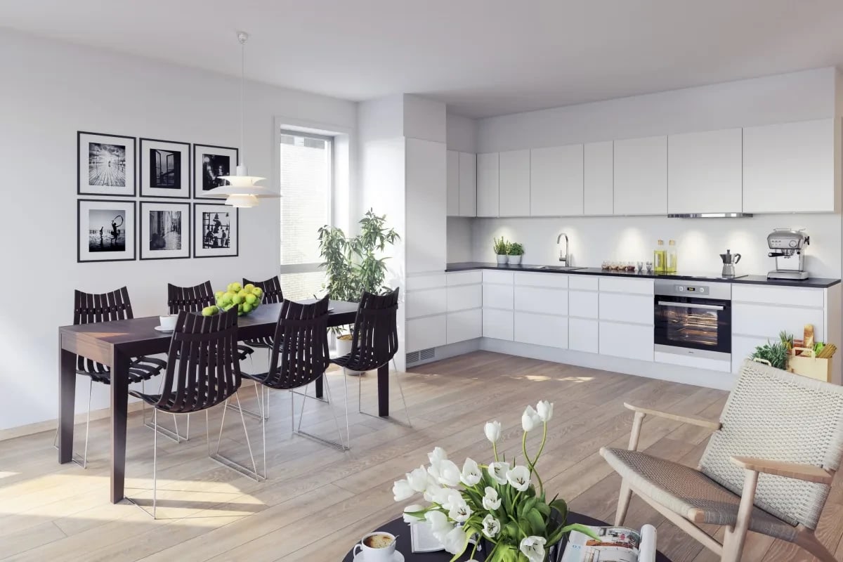 Leilighetene leveres med parkett på alle gulv, vannbåren gulvvarme, balansert ventilasjon, flislagt bad med varmekabler, balkong eller terrasse, kvalitetskjøkken fra Sigdal og parkeringsplass i garasjekjeller med heis opp til alle leilighetsplan.