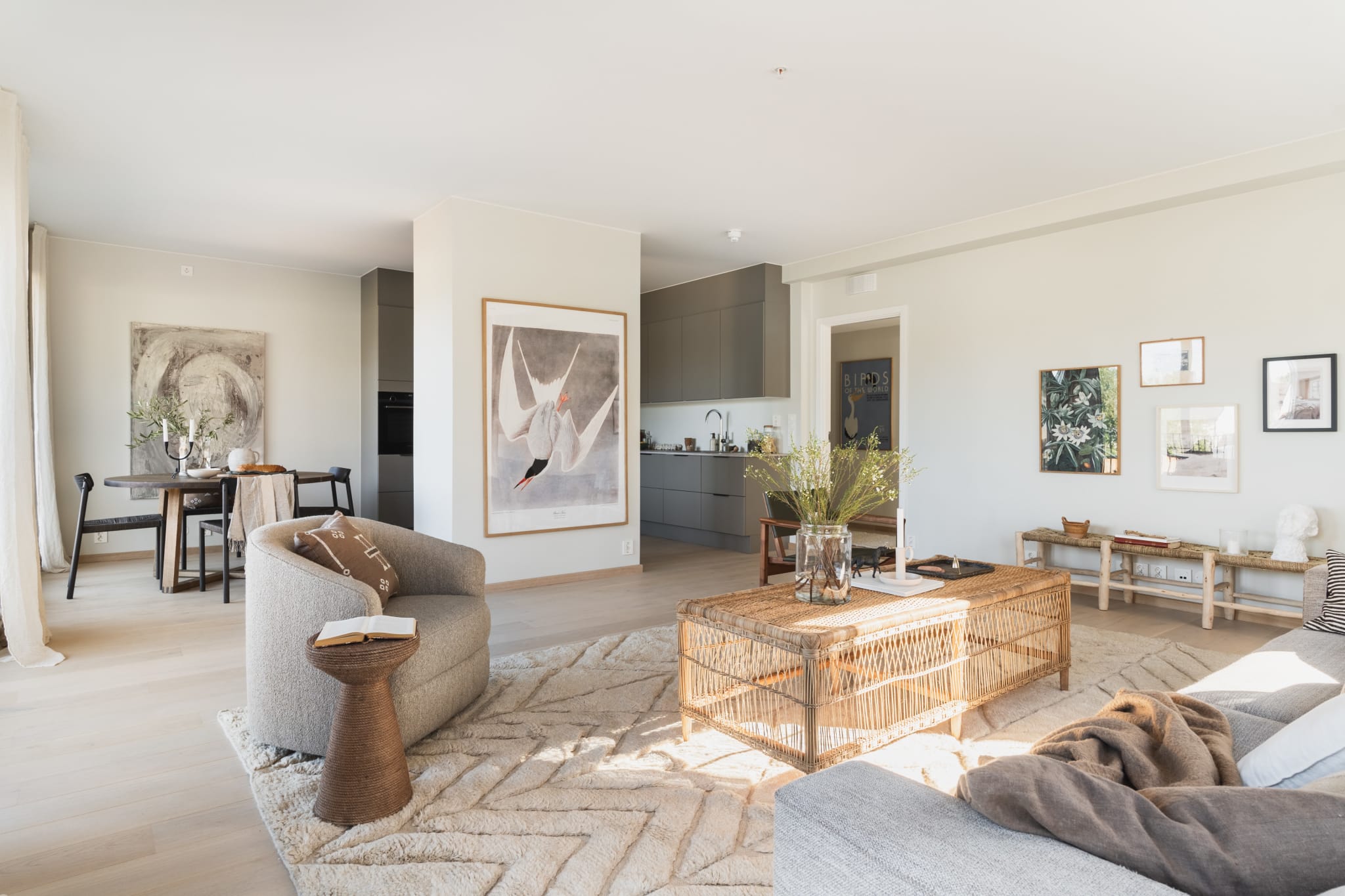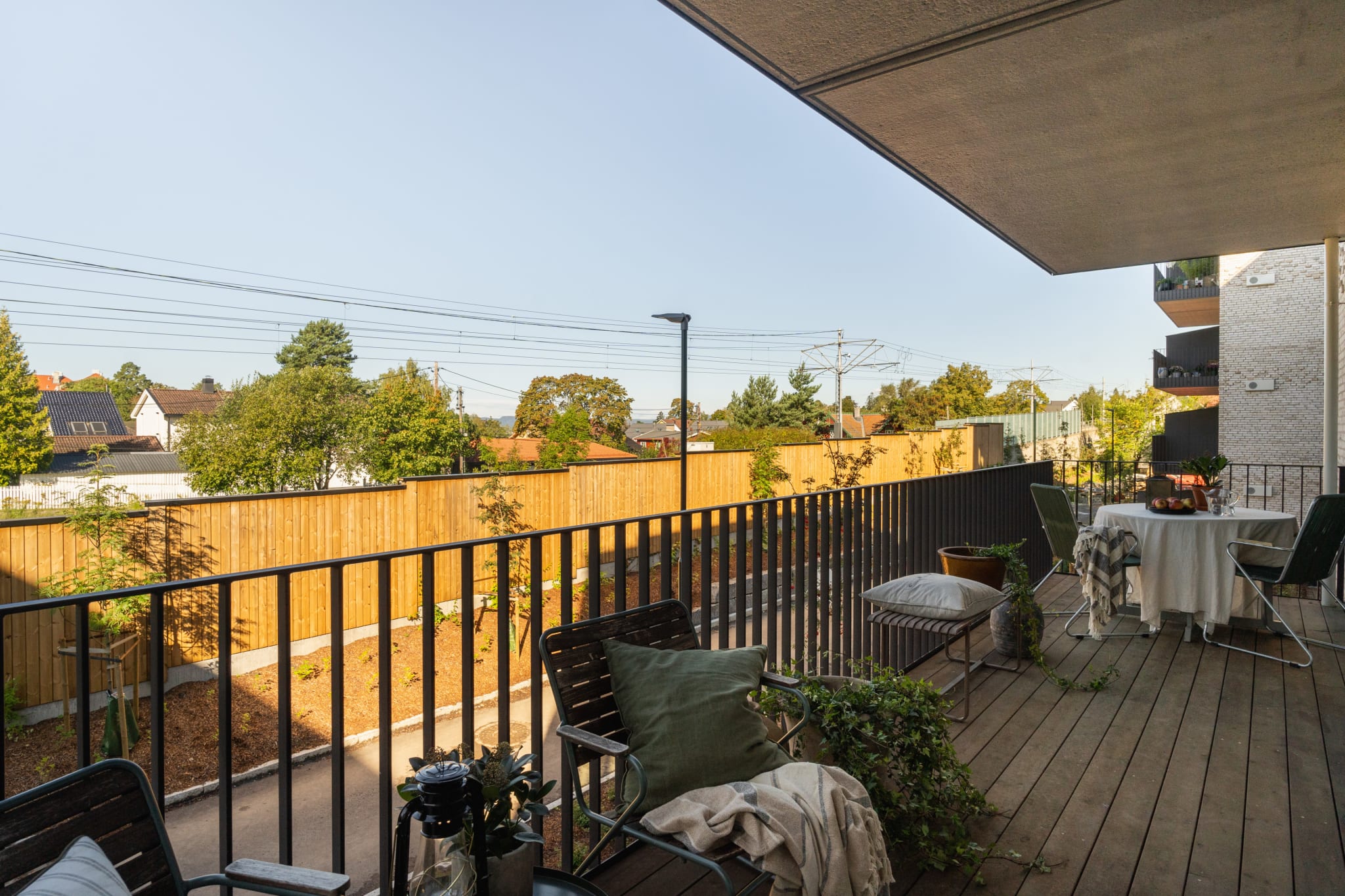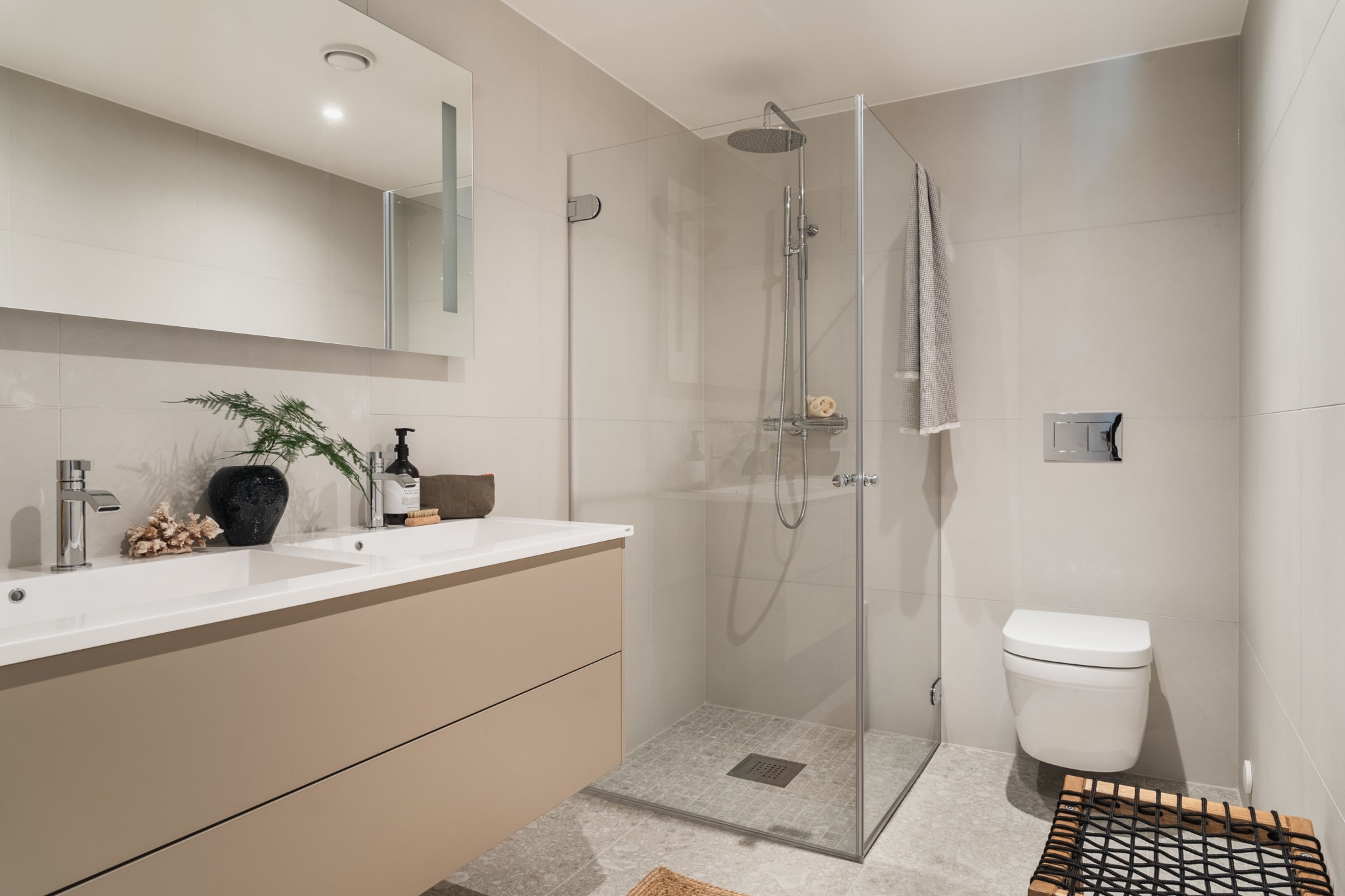 Eksklusiv 4-roms hjørneleilighet med 15,6 kvm stor vestvendt og solrik balkong. Hovedsoverom med en-suite bad og walk-in closet, skyvedørsgarderobe i entré, tre soverom, to bad og lekker åpen stue- og kjøkkenløsning med høy standard. Store vinduer sikrer rikelig med lysinnslipp, og screens på vinduer mot syd og vest bedrer inneklimaet.