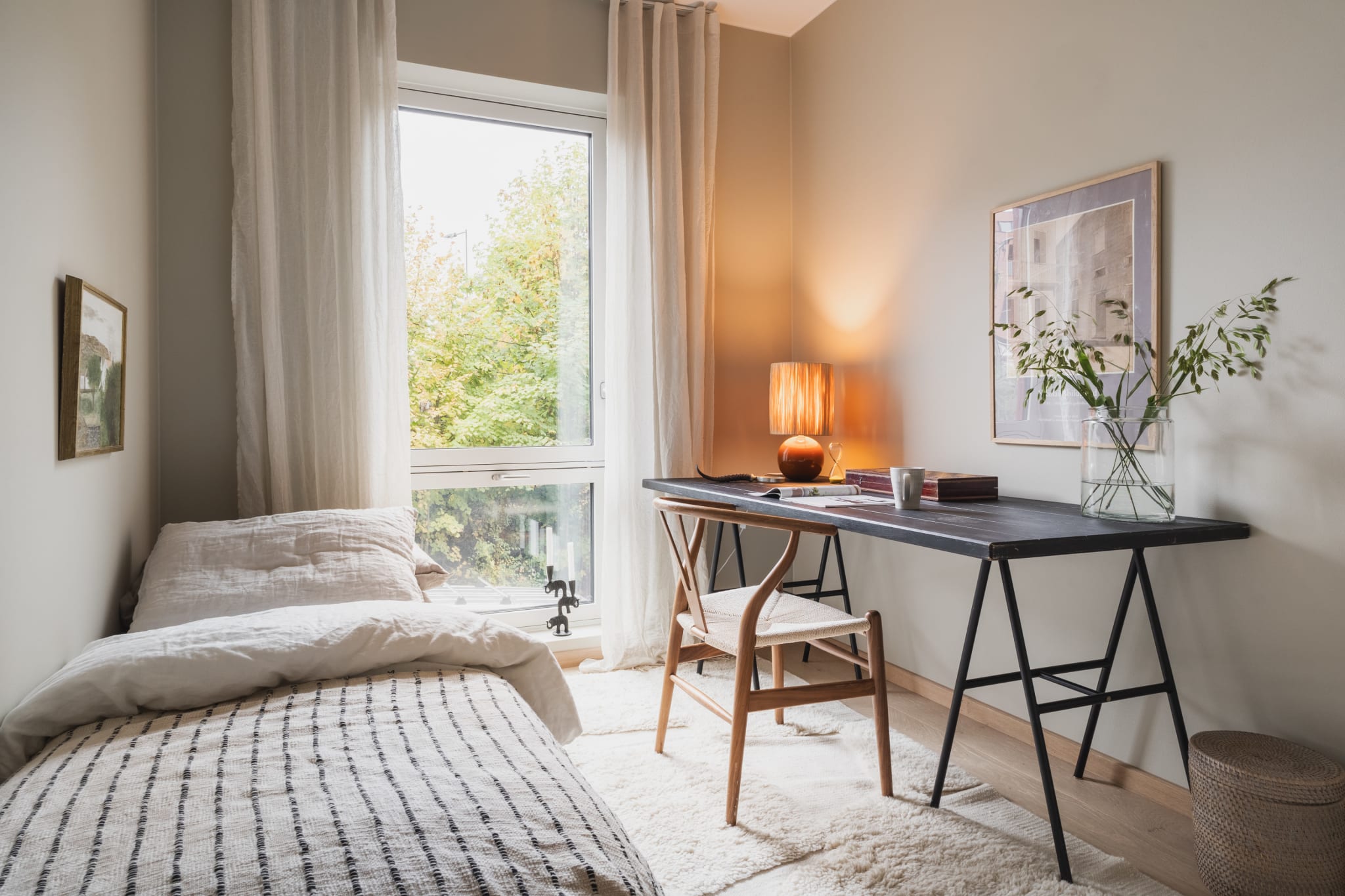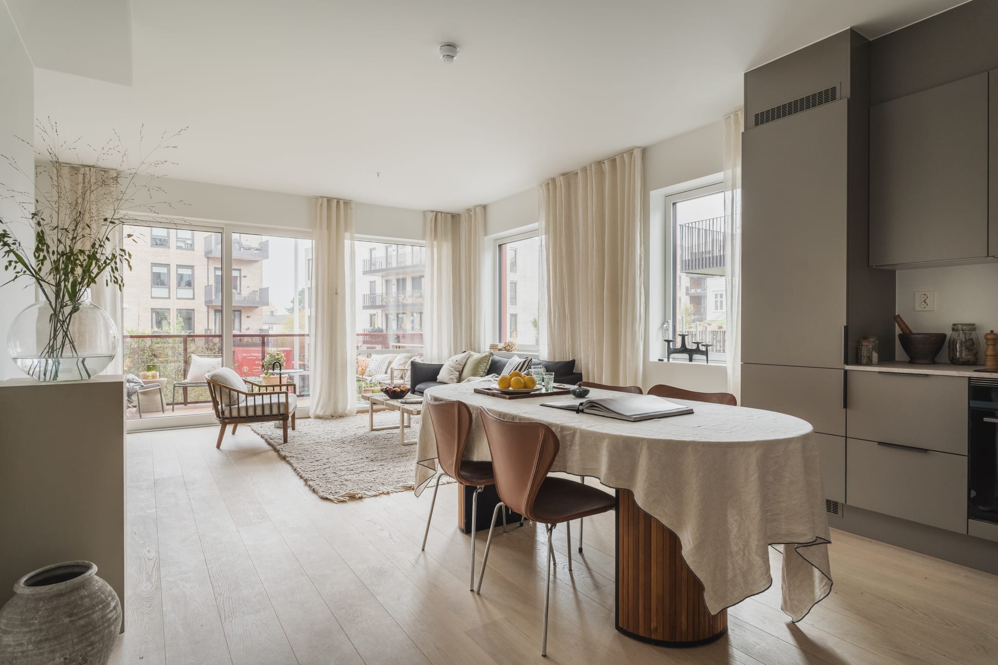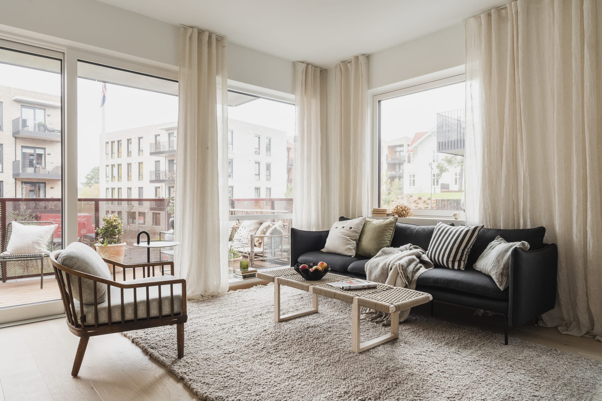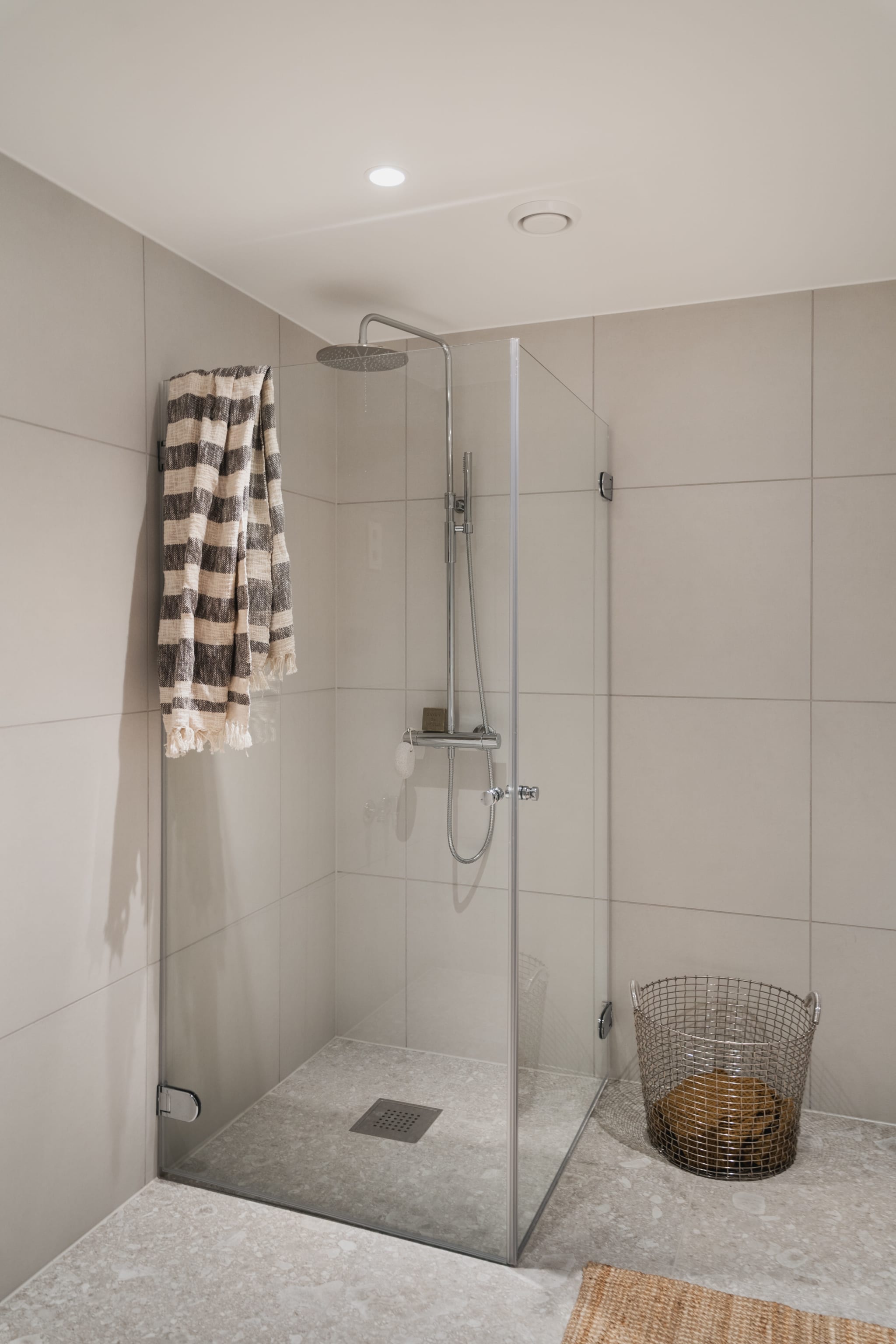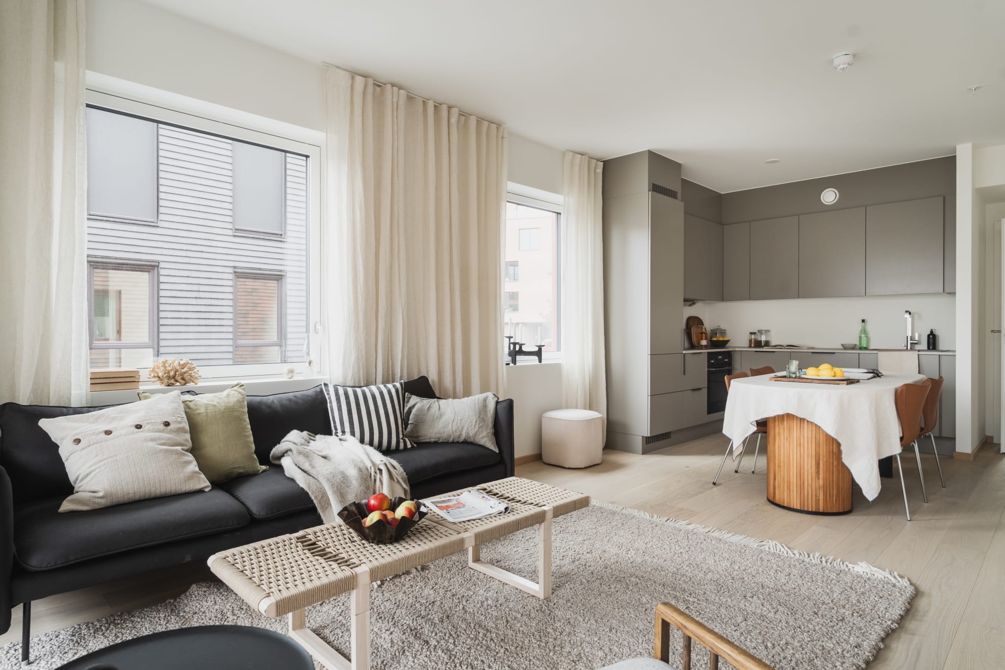 Høy standard som HTH kjøkken med integrerte hvitevarer fra Siemens, 1-stavs eikeparkett, screens på vinduer vendt mot syd/vest, vannbåren gulvvarme, balansert ventilasjon, bad med storformat fliser, regndusj og HTH baderomsinnredning.