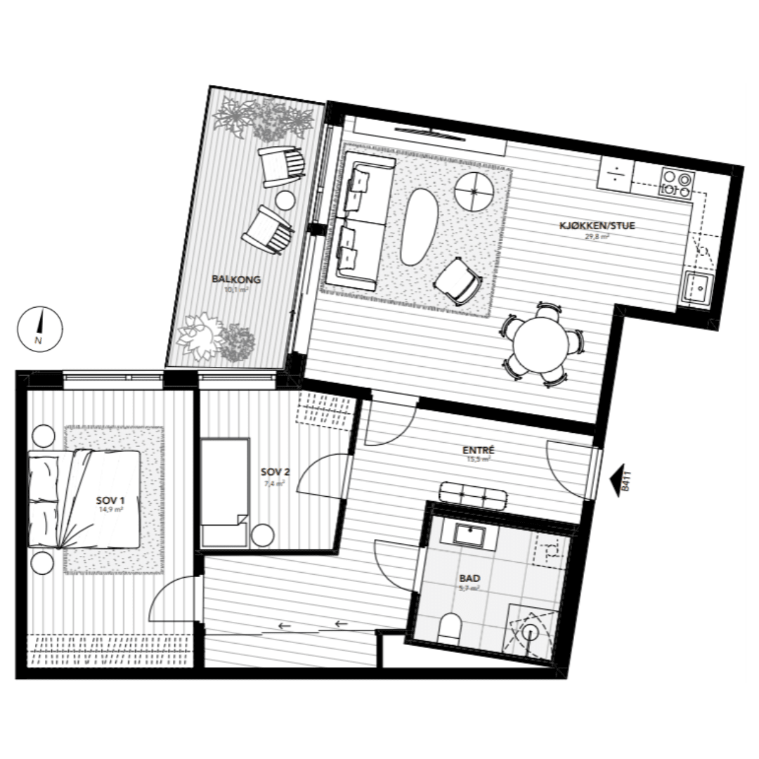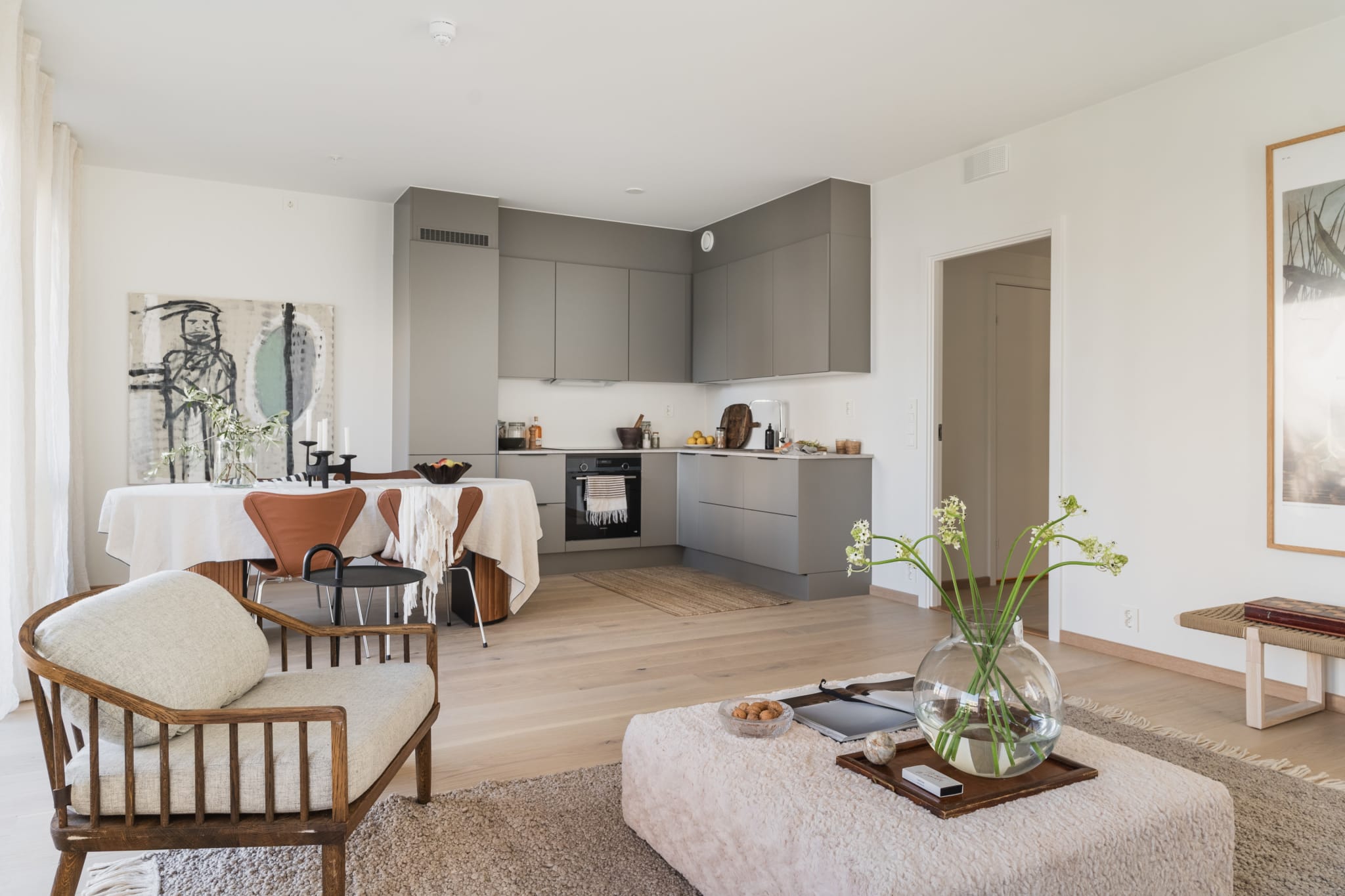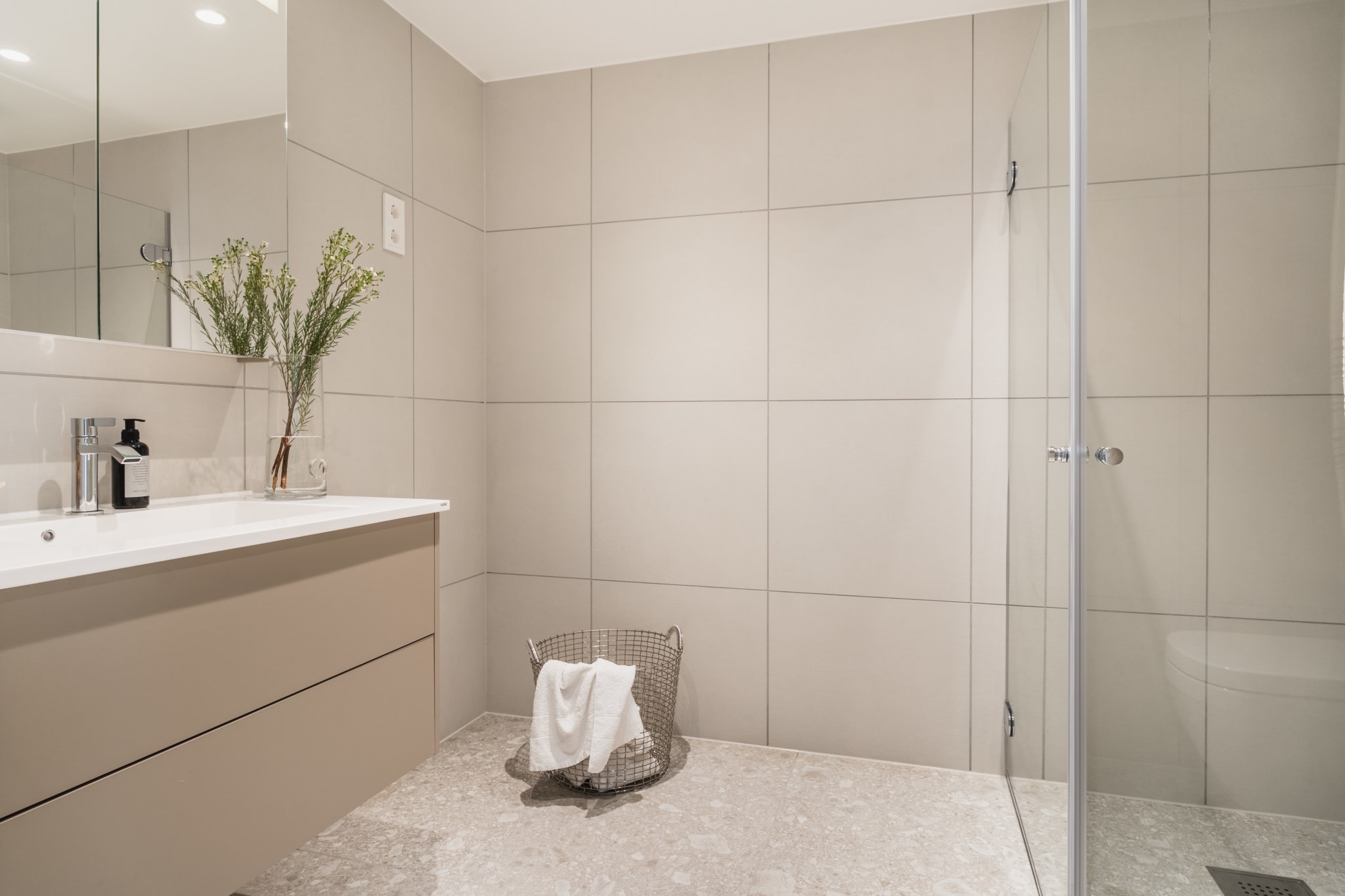 Flott 3-roms toppleilighet med stor balkong vendt mot frodig hageanlegg. Gode oppbevaringsmuligheter i romslig entré og høy standard.