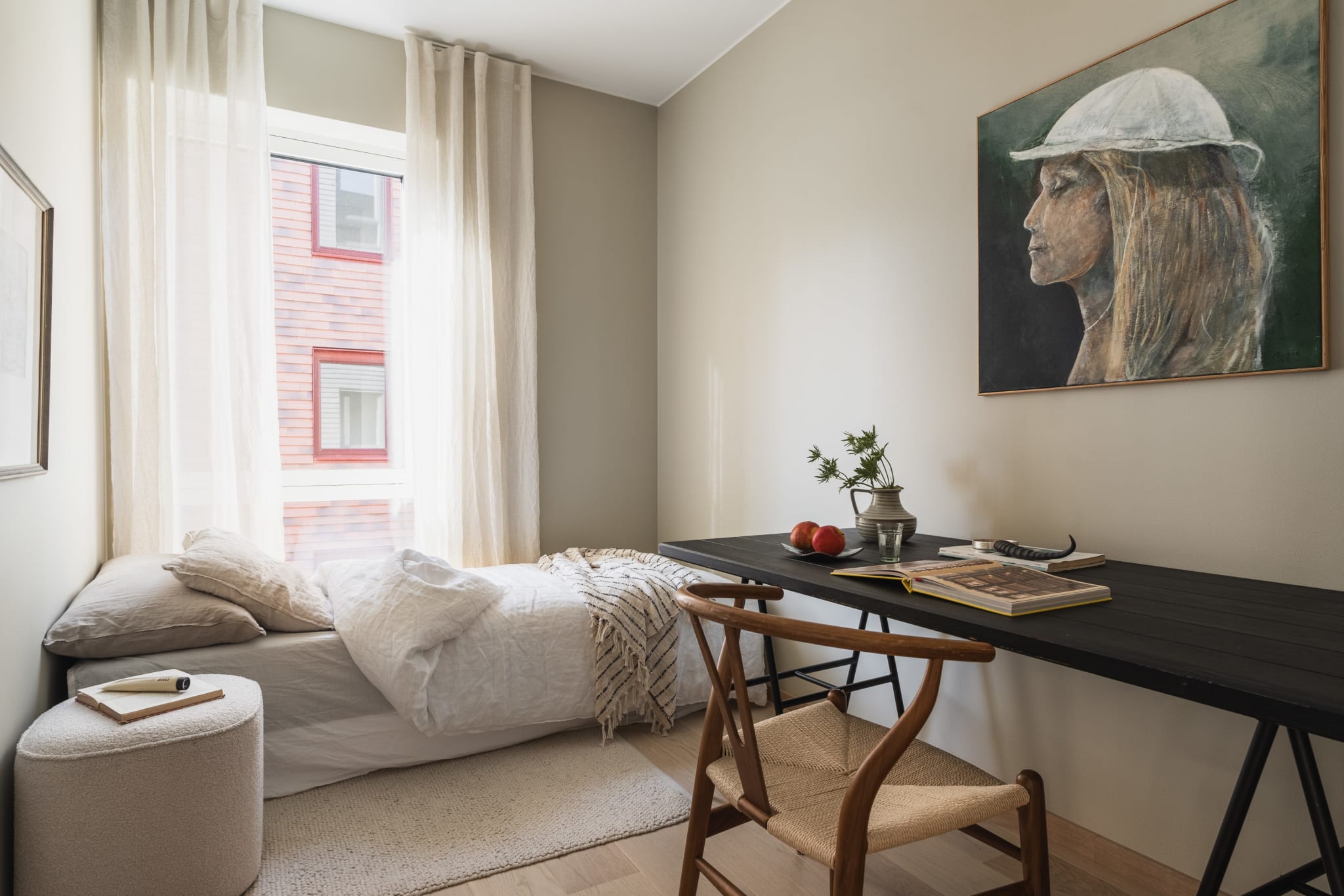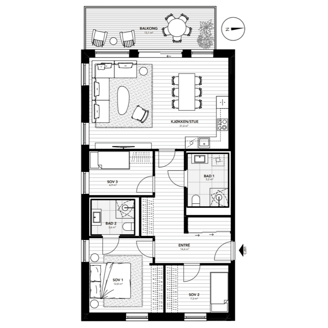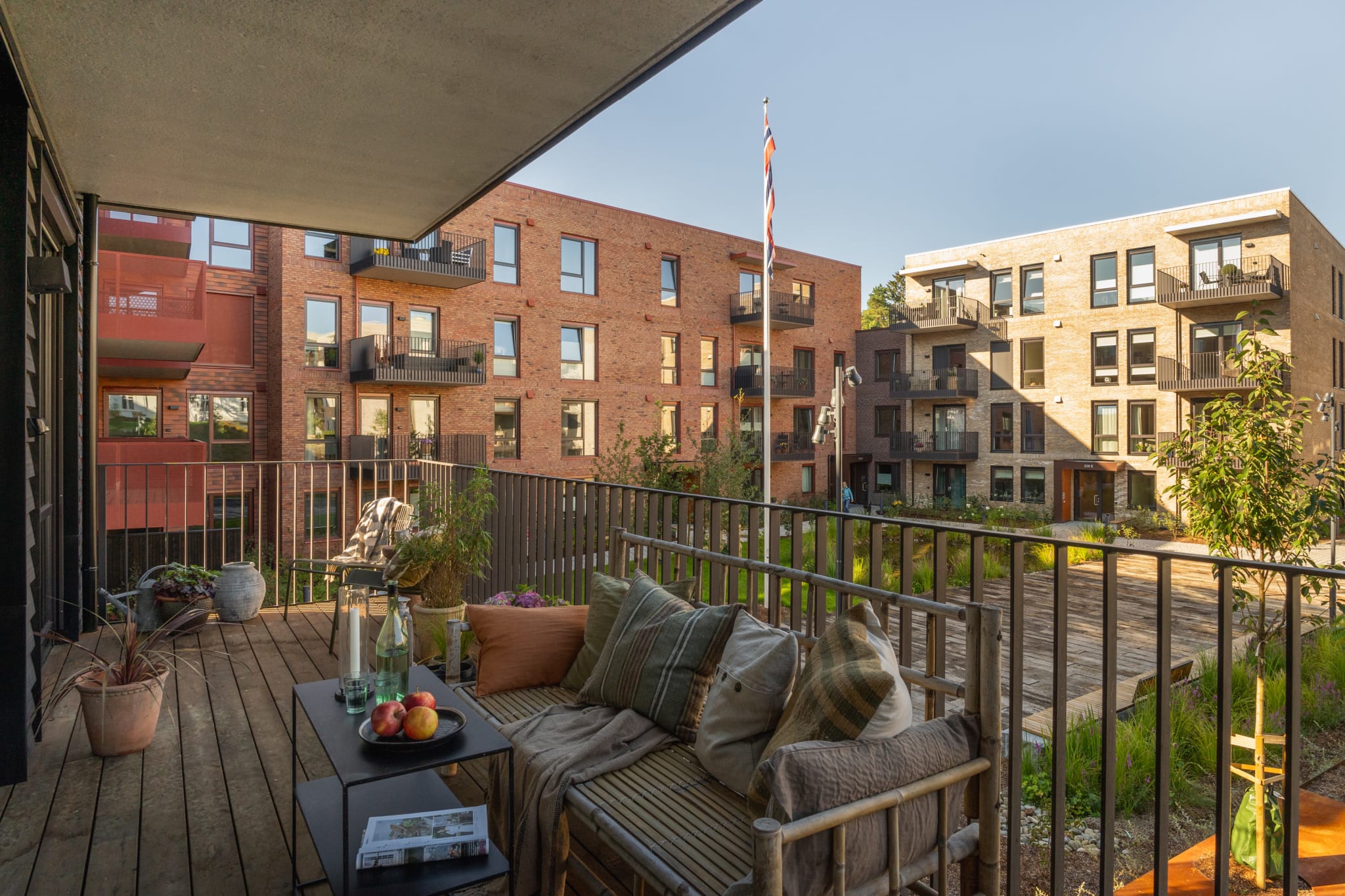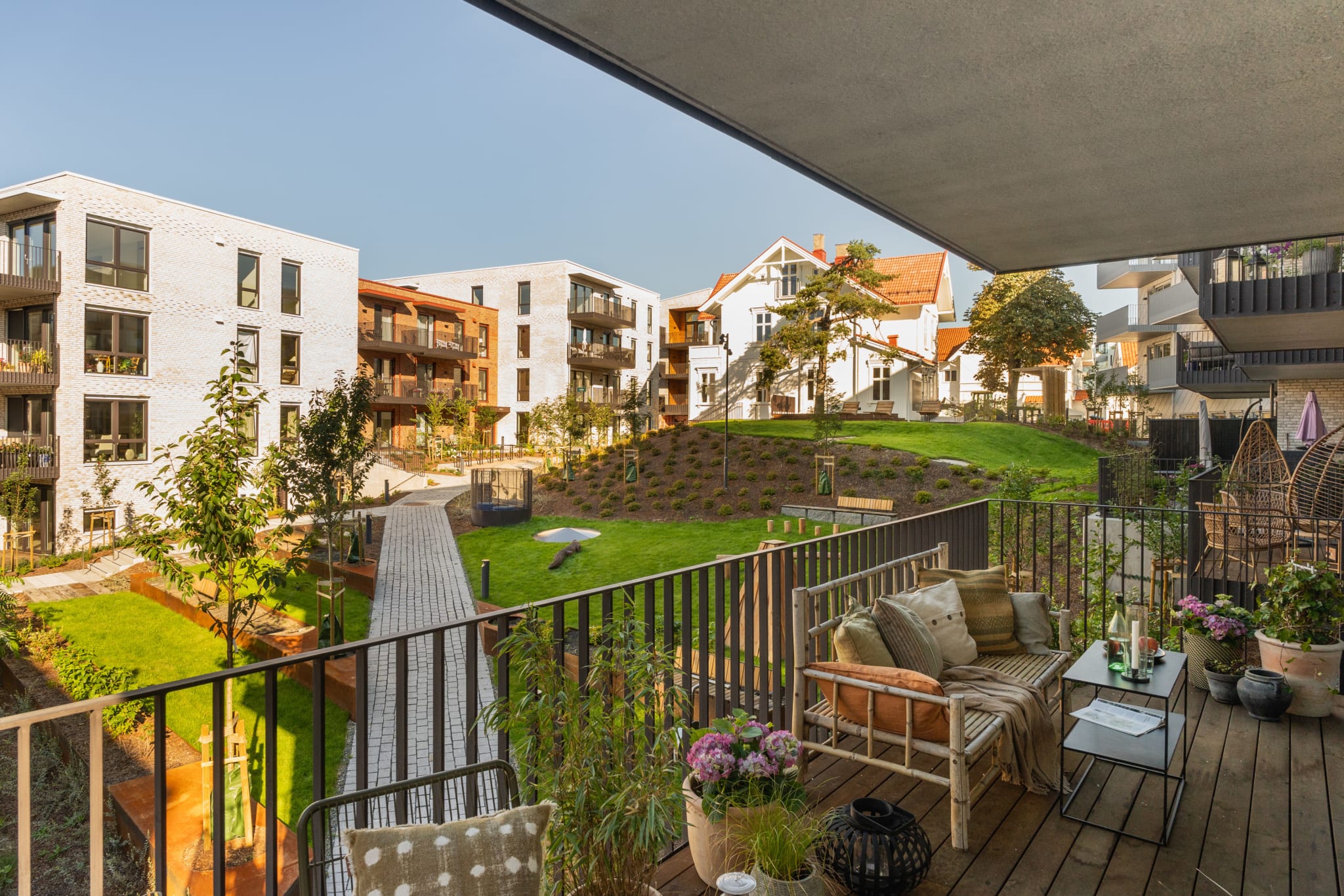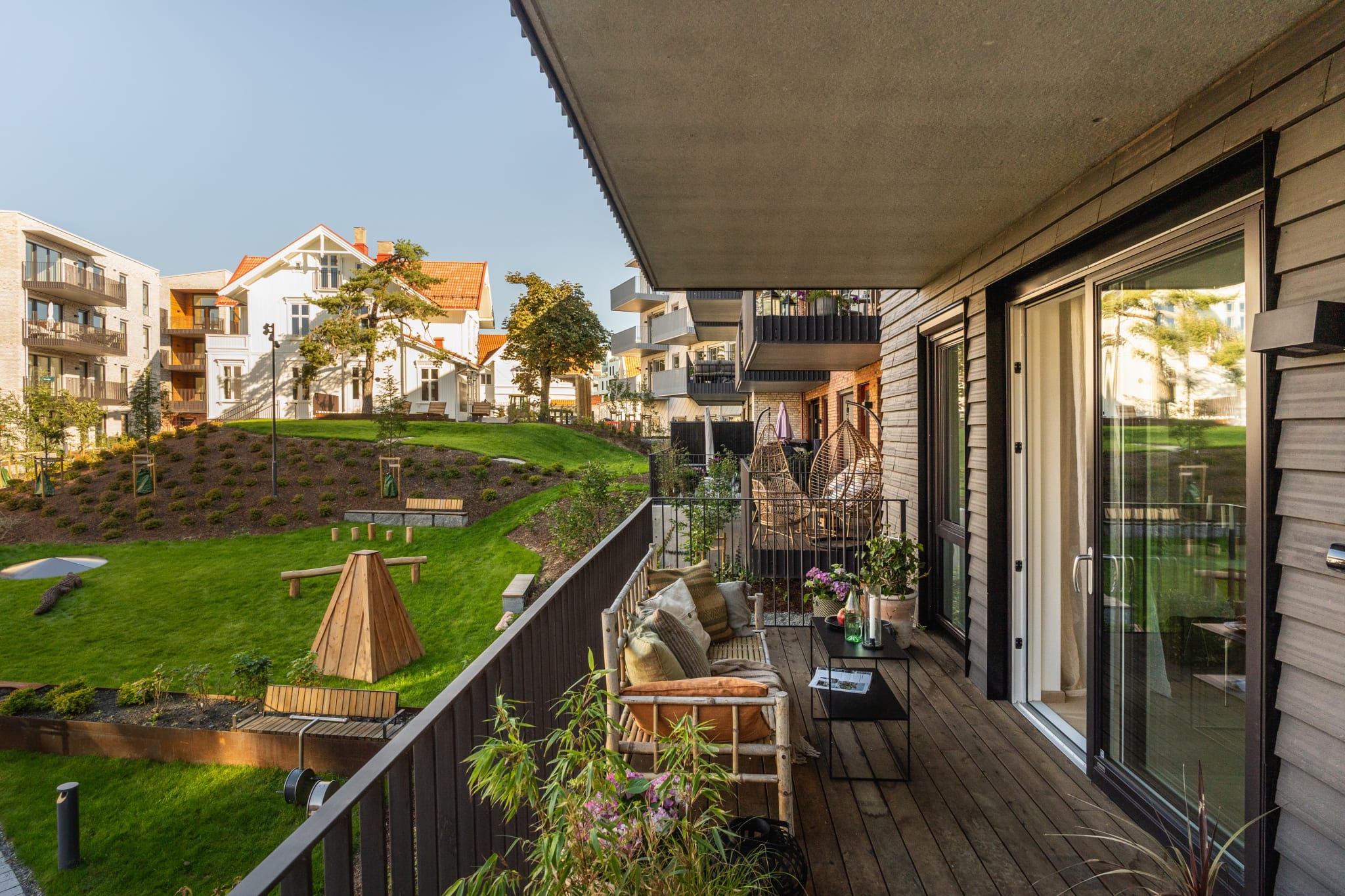 4-roms hjørneleilighet med stor og vestvendt balkong vendt mot frodig hageanlegg, tre soverom, to bad og romslig entré. Hovedsoverom med en-suite bad, gode oppbevaringsmuligheter og høy standard.