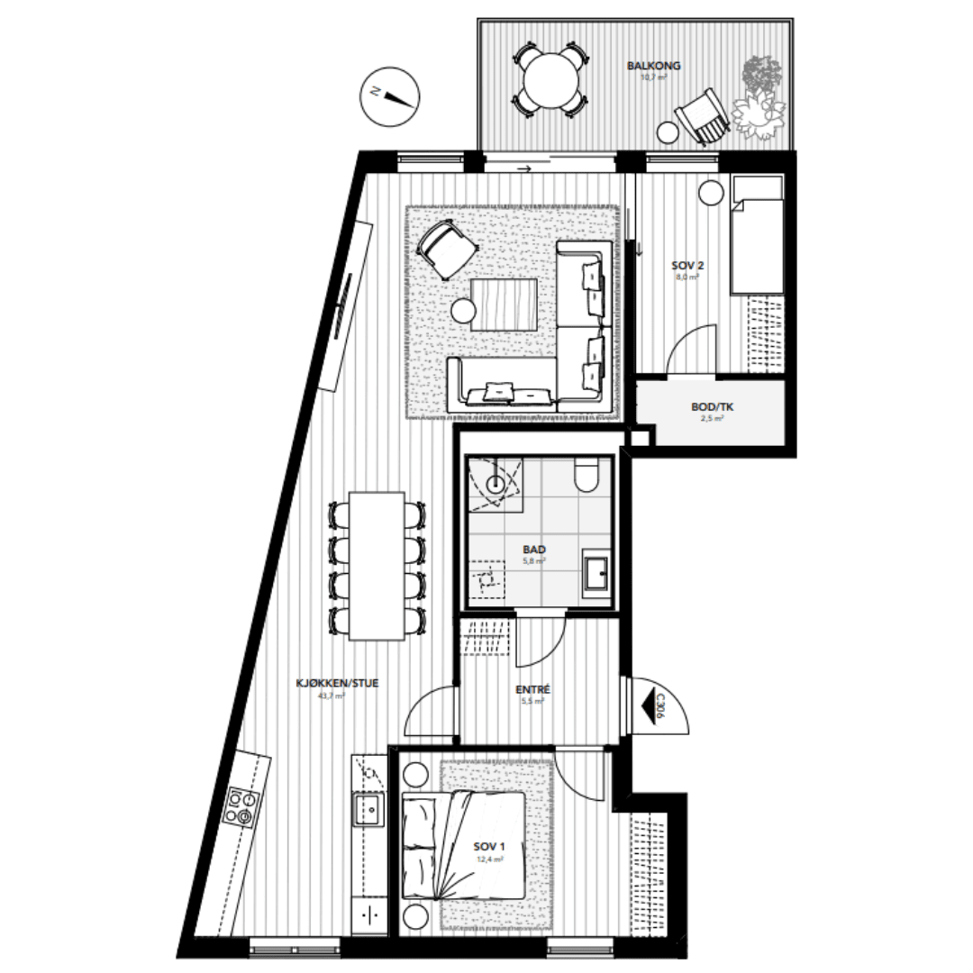 Gjennomgående 3-roms leilighet med stor sydvendt balkong vendt mot frodig hageanlegg. Romslig hovedsoverom med avsatt plass til garderobeløsning, og innvendig bod på soverom nr. 2. Planløsning med naturlige møbleringssoner, og delvis separat kjøkken.