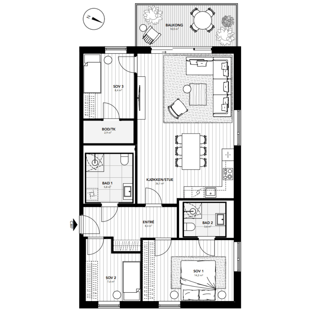 4-roms hjørneleilighet med gjennomgående planløsning og vestvendt balkong mot frodig hageanlegg. Tre soverom, to bad, hovedsoverom med en-suite bad og innvendig bod på soverom nr. 3.