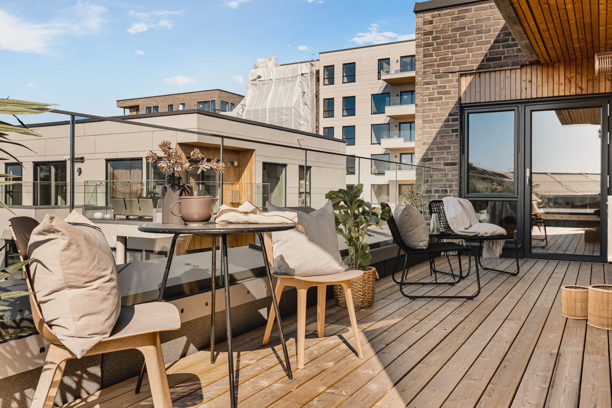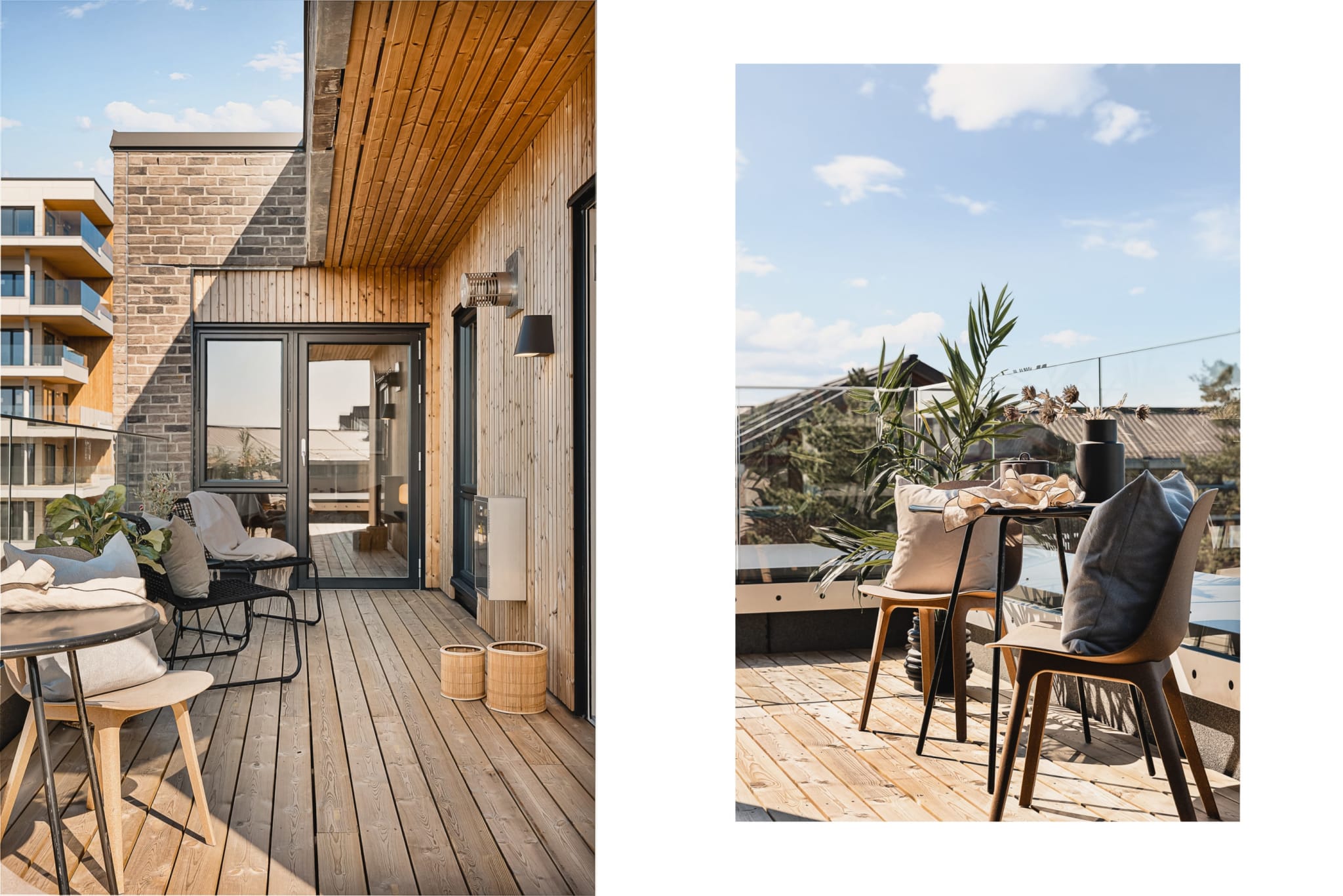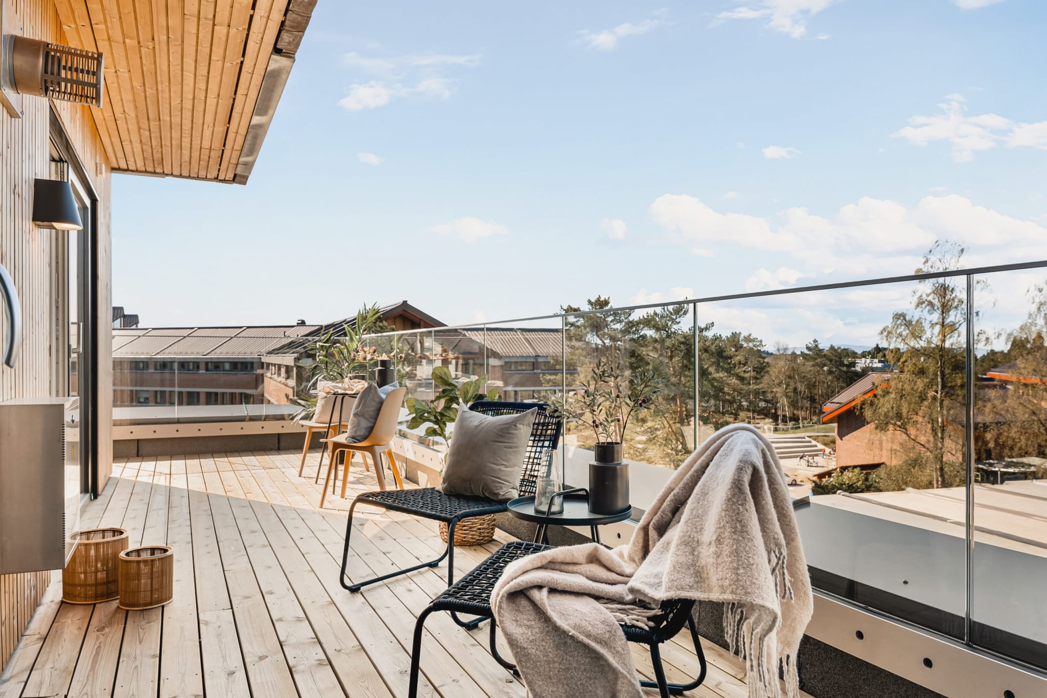 Leilighetene har romslige balkonger eller terrasser med gode solforhold. Det er opparbeidet hyggelige felles uteoppholdsarealer.