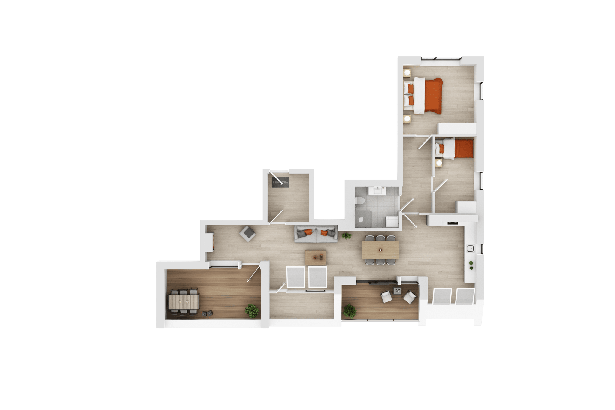 Leilighet E402 er en unik og stor 3-roms leilighet med privat takterrasse og fantastisk sjøutsikt. Leiligheten har åpen stue- og kjøkkenløsning med utgang til 13,7 kvm stor takterrasse og 8,2 kvm stor balkong, to soverom, mellomgang, bad og entré.